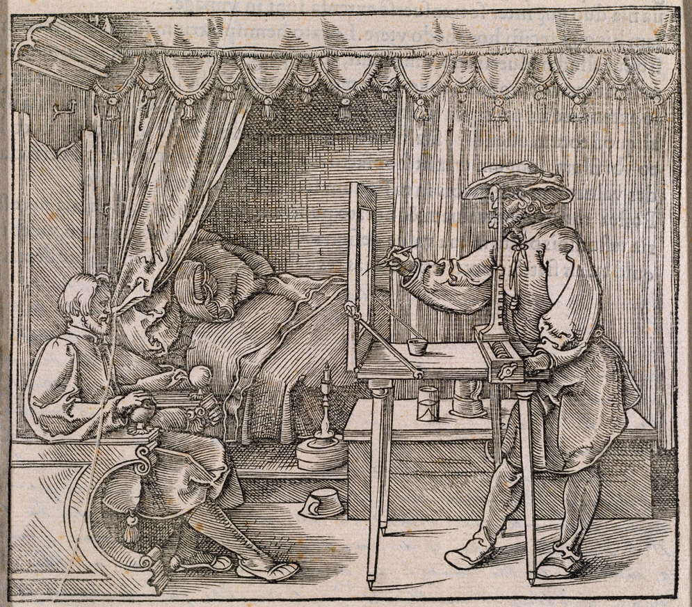 The artist on the right hand side views his subject through a thin sheet of paper divided into a grid, and draws in each grid square whatever he can see there. He's really tracing the subject.