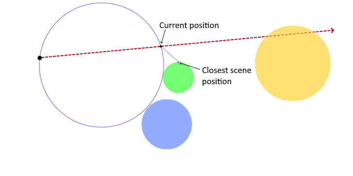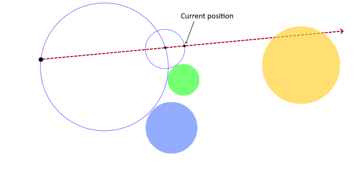 From our new position, we again ask how far are we from a point in the scene now. The blue dot shows the answer, so we know it's safe to step that distance along the ray again because there can't possibly be anything in the way.