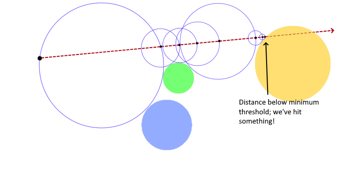 We repeat this until the distance from our current point to the nearest geometry drops below some small value, and declare that we have indeed hit something in the scene.