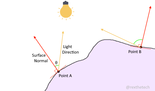 In the diagram, point A will be much brighter than point B. Note this only depends on the angle between surface normal and light direction, and not the distance from the point to the light source.