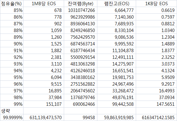 (이오스램의 시장가치는 뱅코르 알고리즘에 의해 점유율에 따라 가격이 자동 산정된다. 이오스 램 점유률이 80~85% 미만인 상태에서 램을 확장하는 것은 그닥 의미가 없기 때문에 램 점유율이 85%를 넘나들어야 램은 확장될 것이다. 이것이 내가 킬로바이트당 0.5이오스 정도가 적정 가격이라고 생각하는 근거이다. 램 점유율 85%에서 램의 가격은 킬로바이트당 0.66 이오스 정도 된다.)