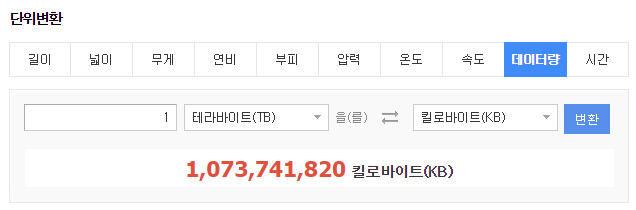1테라바이트는 1,073,741,820 킬로바이트다.