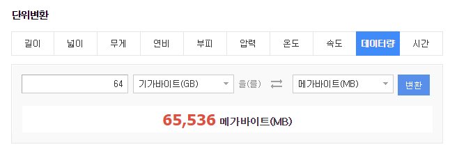 1기가바이트는 1024메가바이트이고 현재 이오스의 램 총량은 64기가바이트입니다. 1024x64=65,536 메가바이트입니다.