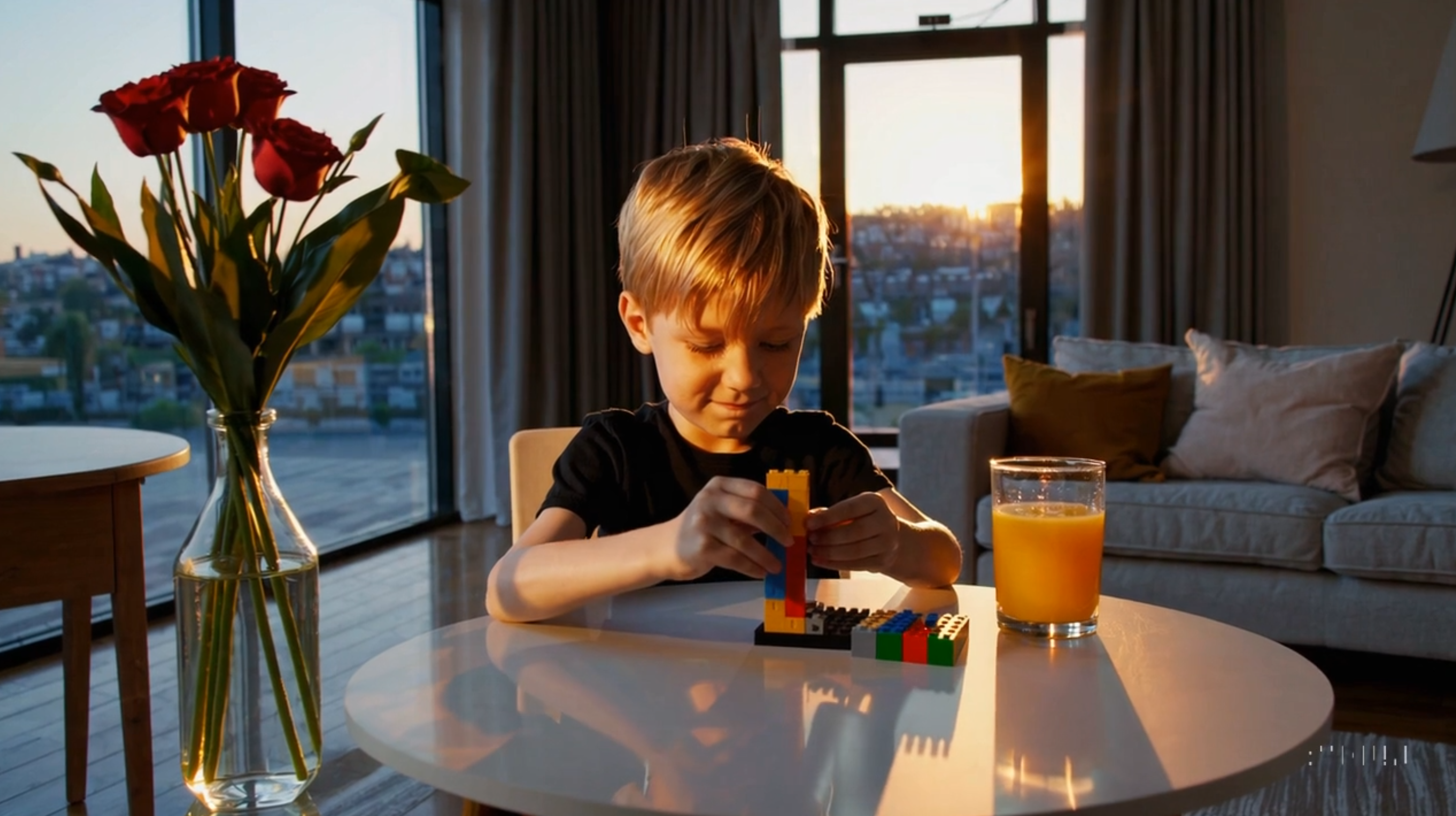 [프롬프트] 귀여운 금발 머리 소년이 햇볕이 은은하게 비치는 거실 현대적 디자인의 원목 테이블 위에서 레고 브릭제품을 조립하고 있다. 그의 표정은 원하는 것을 가진 데서 오는 미소가 살짝 번지고 있다. 테이블 위에는 꽃이 담겨 있는 화병이 있고 그의 앞에는 얼음이 담긴 컵에 오렌지쥬스가 있다.