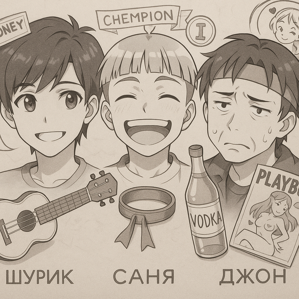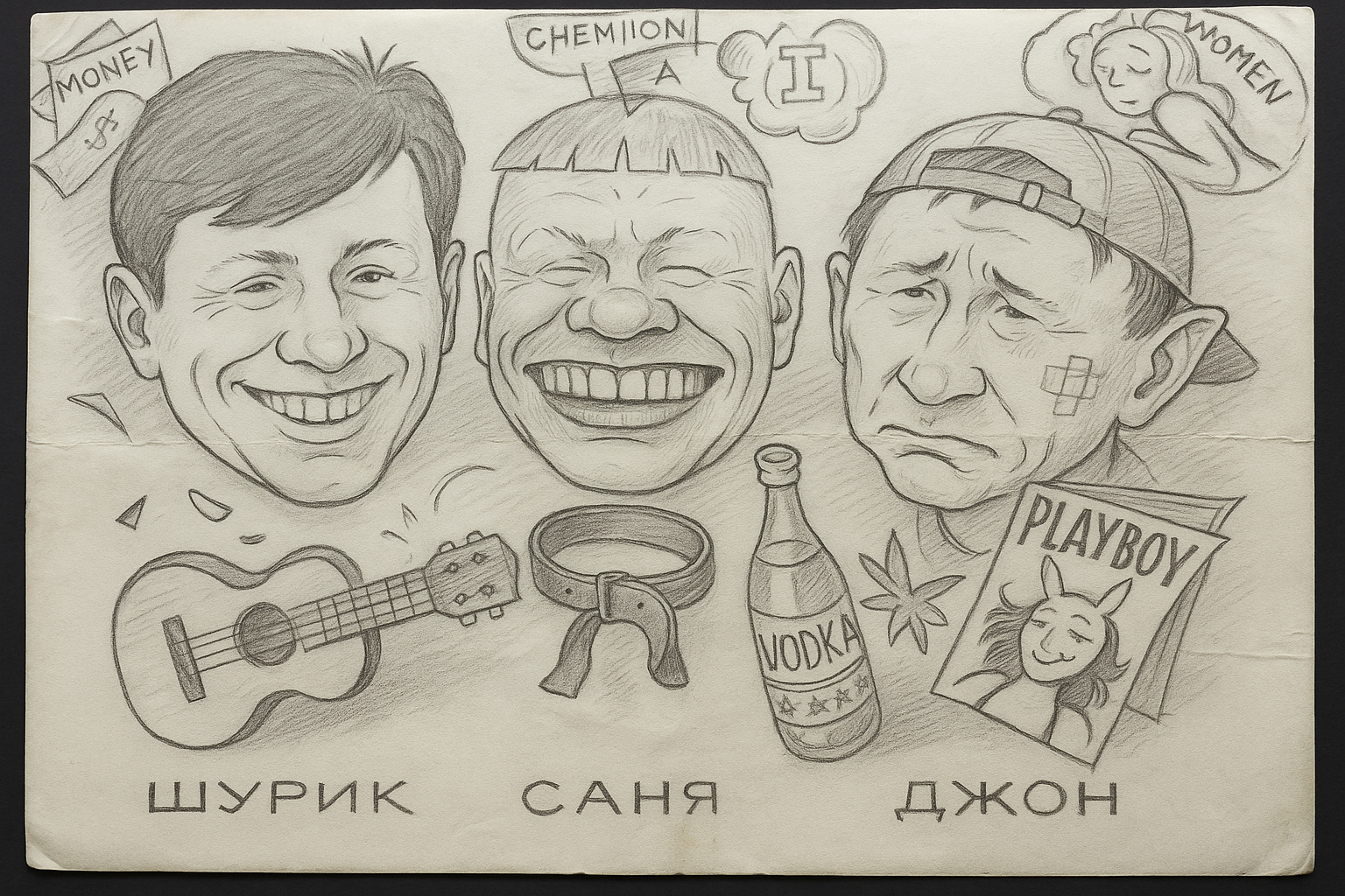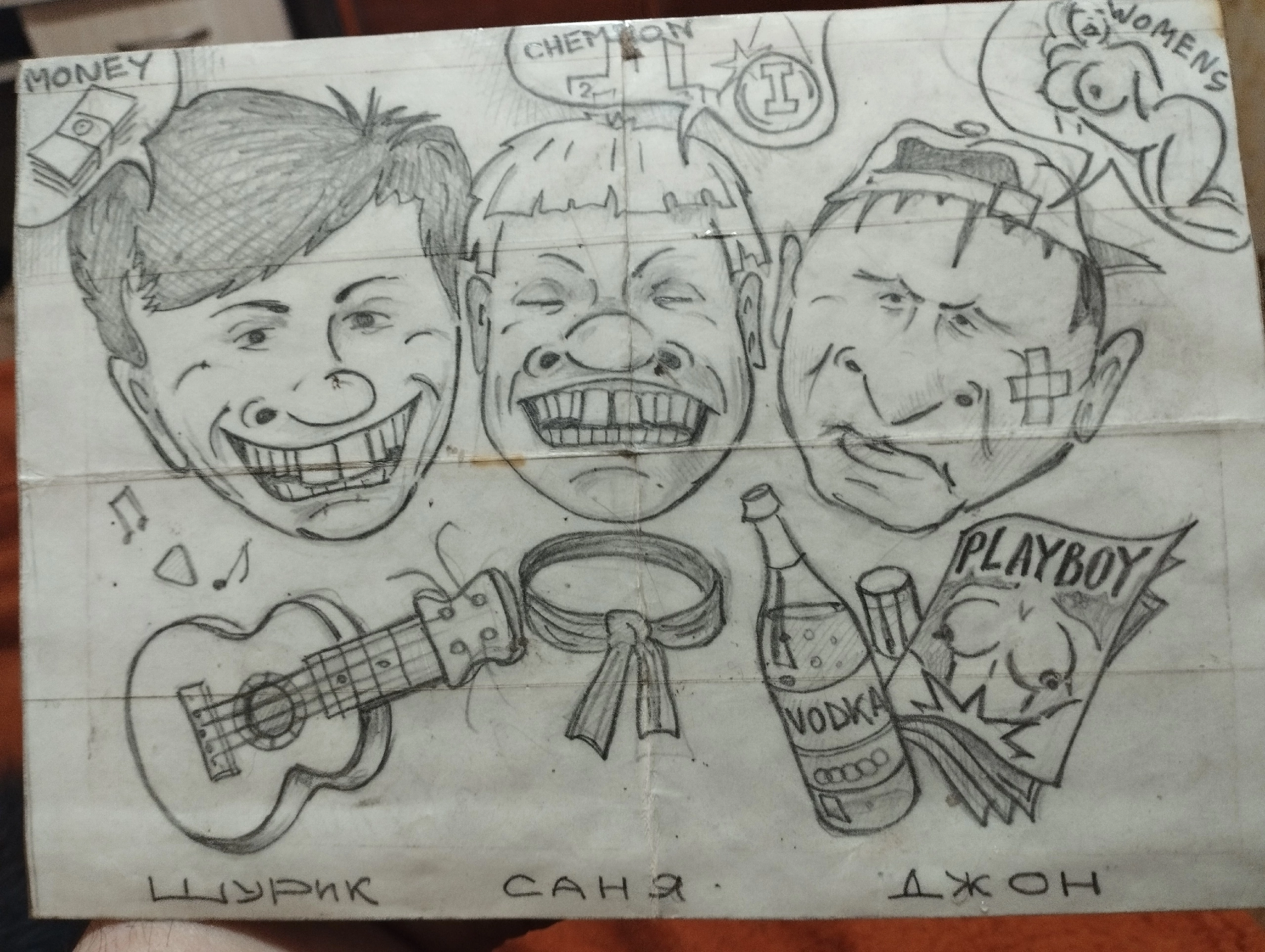 Vovka could draw, and from this photo, he made a caricature of us. He could also play the guitar and was good at basketball. After he finished school, he moved to Russia - about a year after this photo was taken. Recently, I learned from acquaintances that Vovka went to war, and there has been no news from him for a very long time. Most likely, he perished.