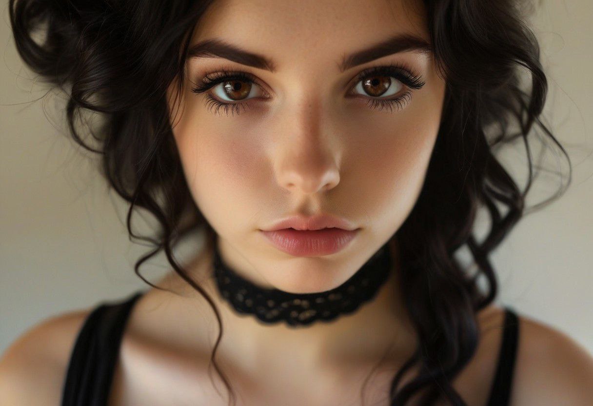Selfie portrait, video call full body, Photography ,beautiful 18 years old EMO, mad look, very sensual, fake shy, dramatic eye makeup, black choker, incredibly pretty, narrow nose, fit, highly detailed features, highest quality, highly detailed skin, freckles, black hair, long hair, fine curly style hair, brown eyes, perfect eyes, detailed eyes, detailed pupils, shy smile, (((gather her hair behind her ear))), the look on her face gives away she is very horny, at girls bedroom, morning sunlight on breasts, sharp focus, 8k resolution,