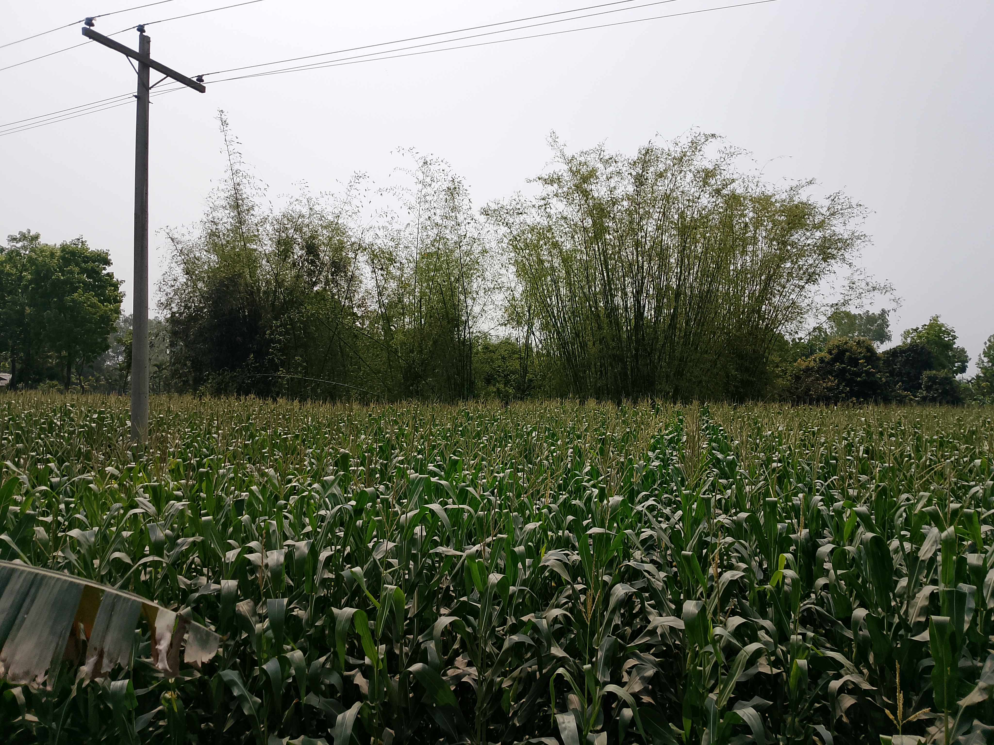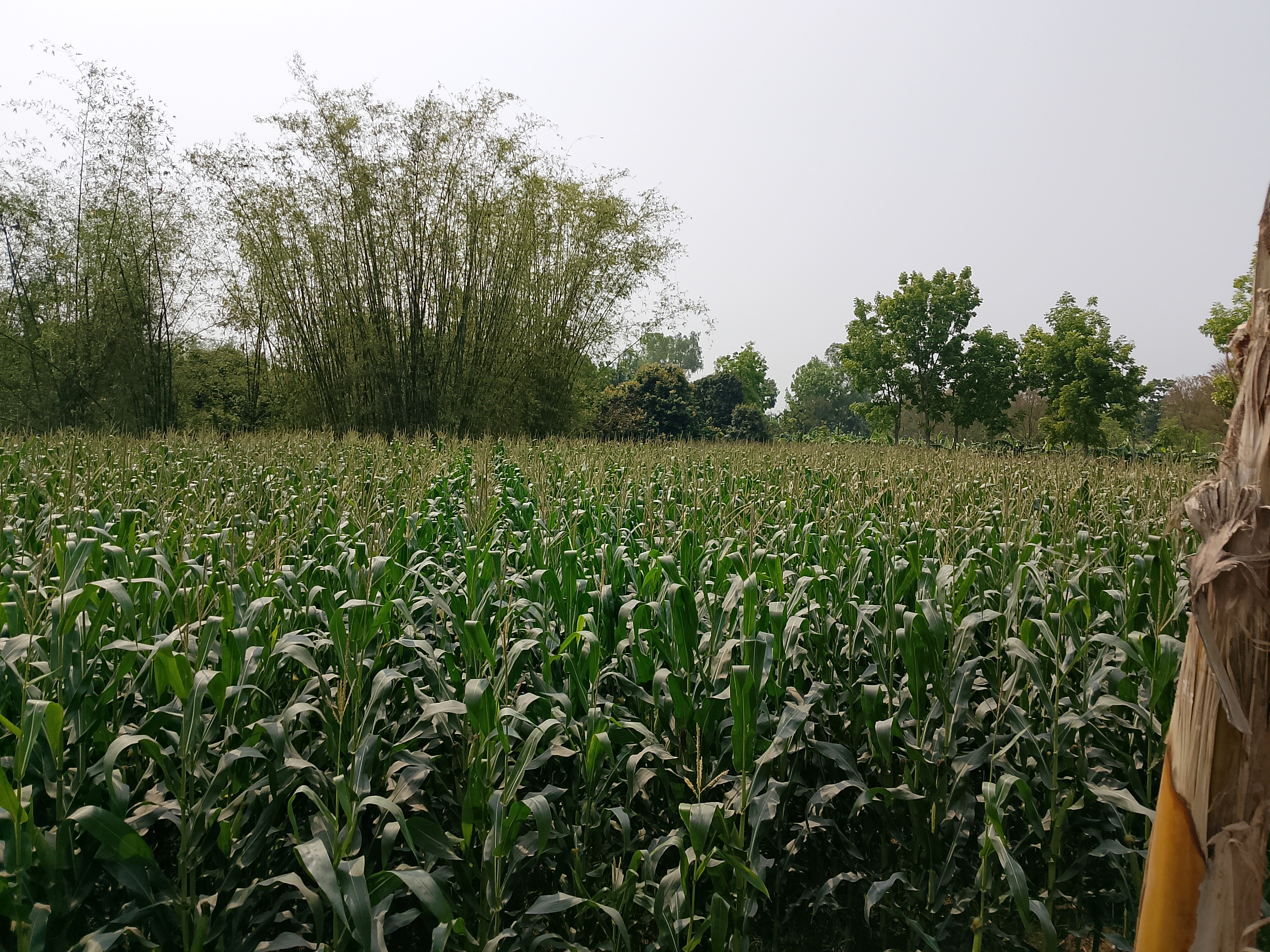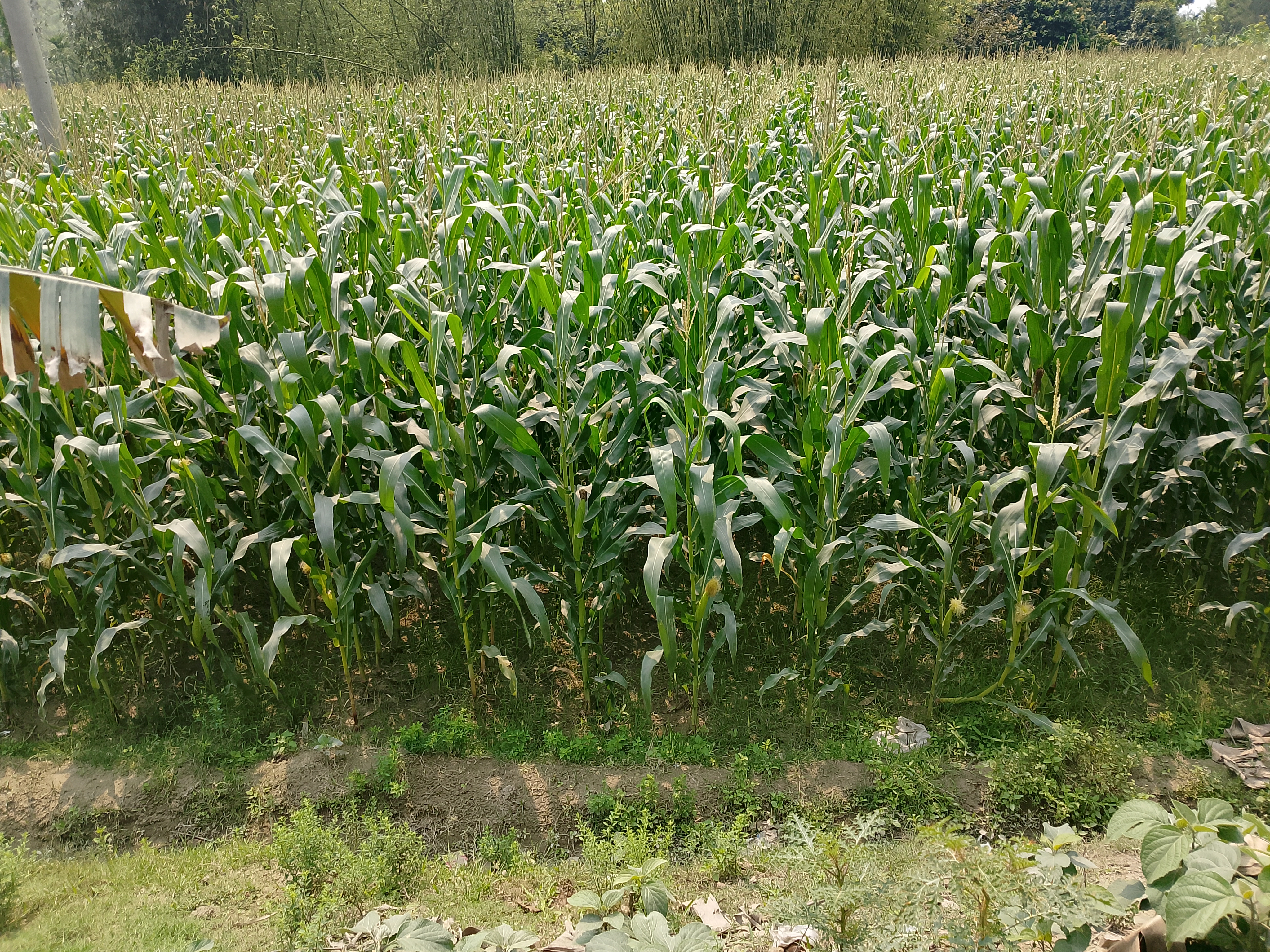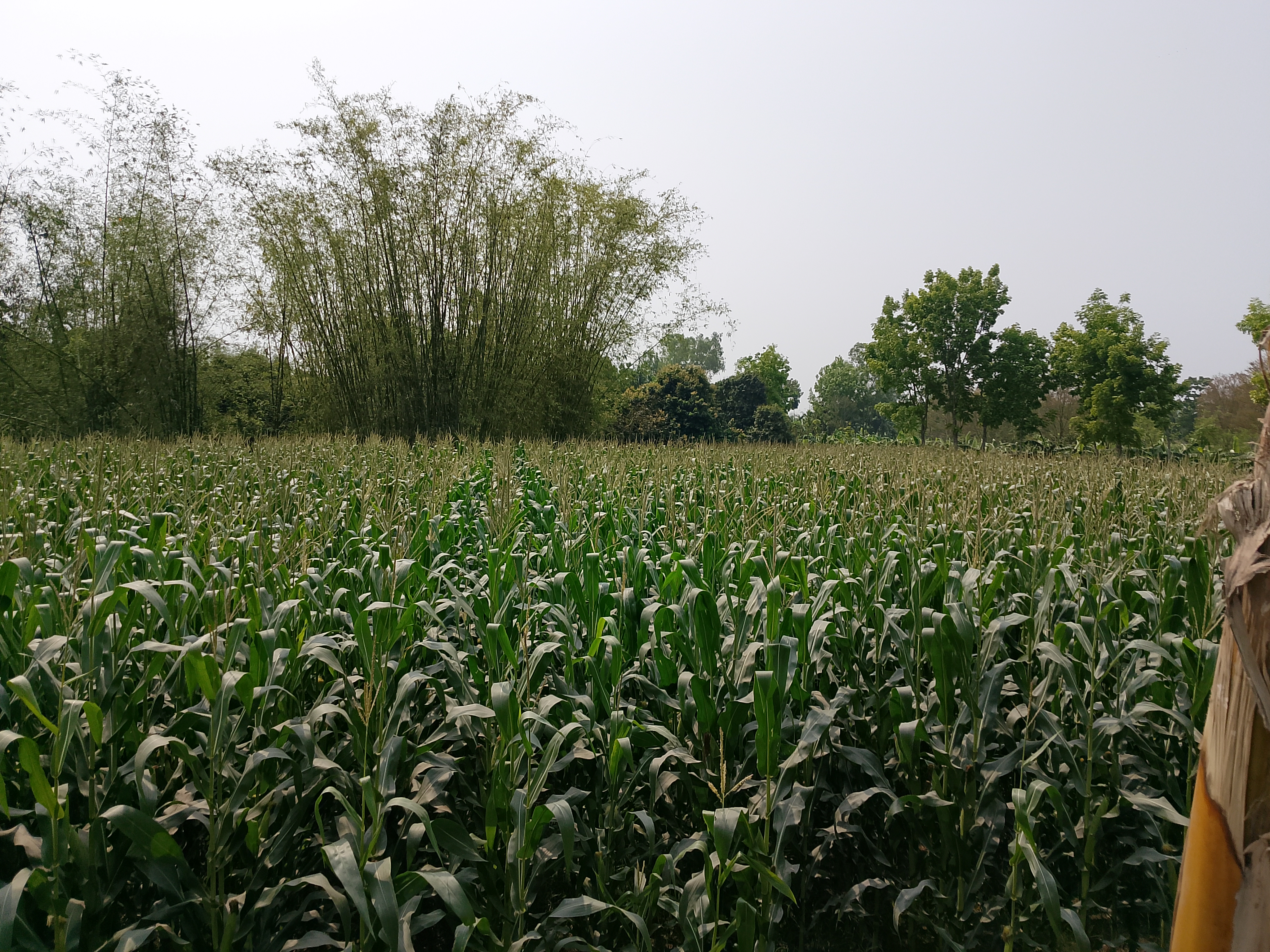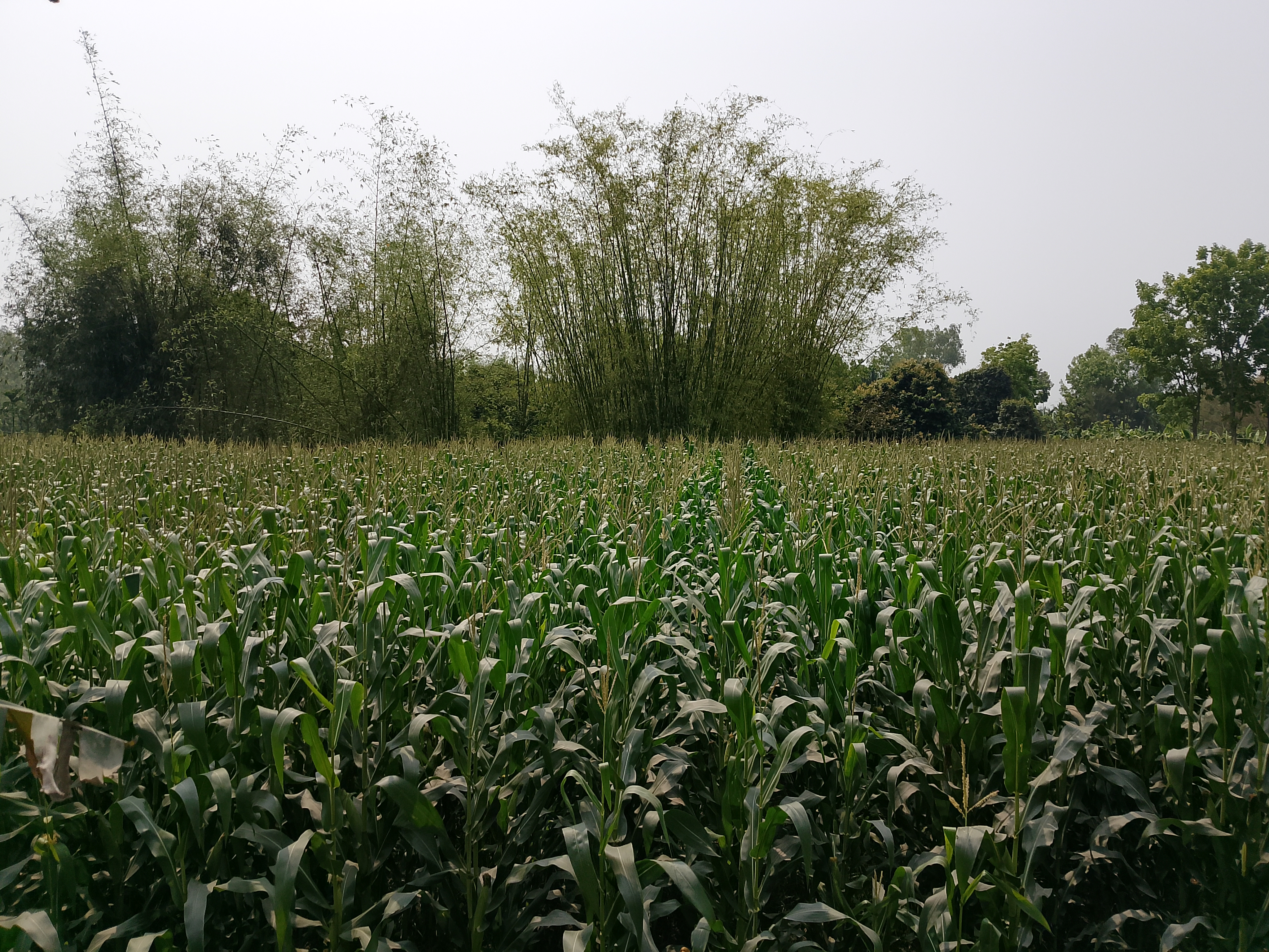 There is a corn field here. Corn has been cultivated over a large area, and it can be seen that there is a bamboo grove behind it. In this corn field, the tassels are visible, and they look very nice. The corn plants have grown quite big. Gradually, the corn field will grow more, and the corn will develop, which will look very nice.