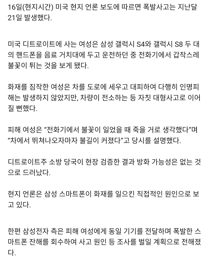 美서 운전 중 삼성 갤럭시S8 폭발..차량 전소