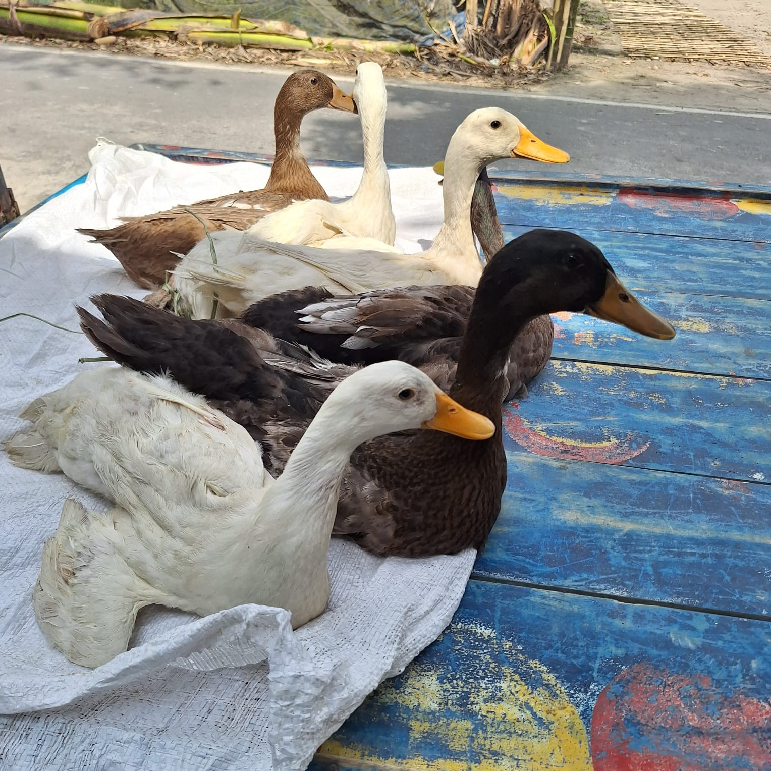 Ducks are a familiar and beloved bird in rural life in Bengal. A few ducks are seen sitting peacefully together. Their white, brown and black-and-white mixed feathers beautifully highlight the diversity of nature. The ducks are resting on a white sack placed on a blue wooden floor, which expresses the simplicity and natural environment of rural life.