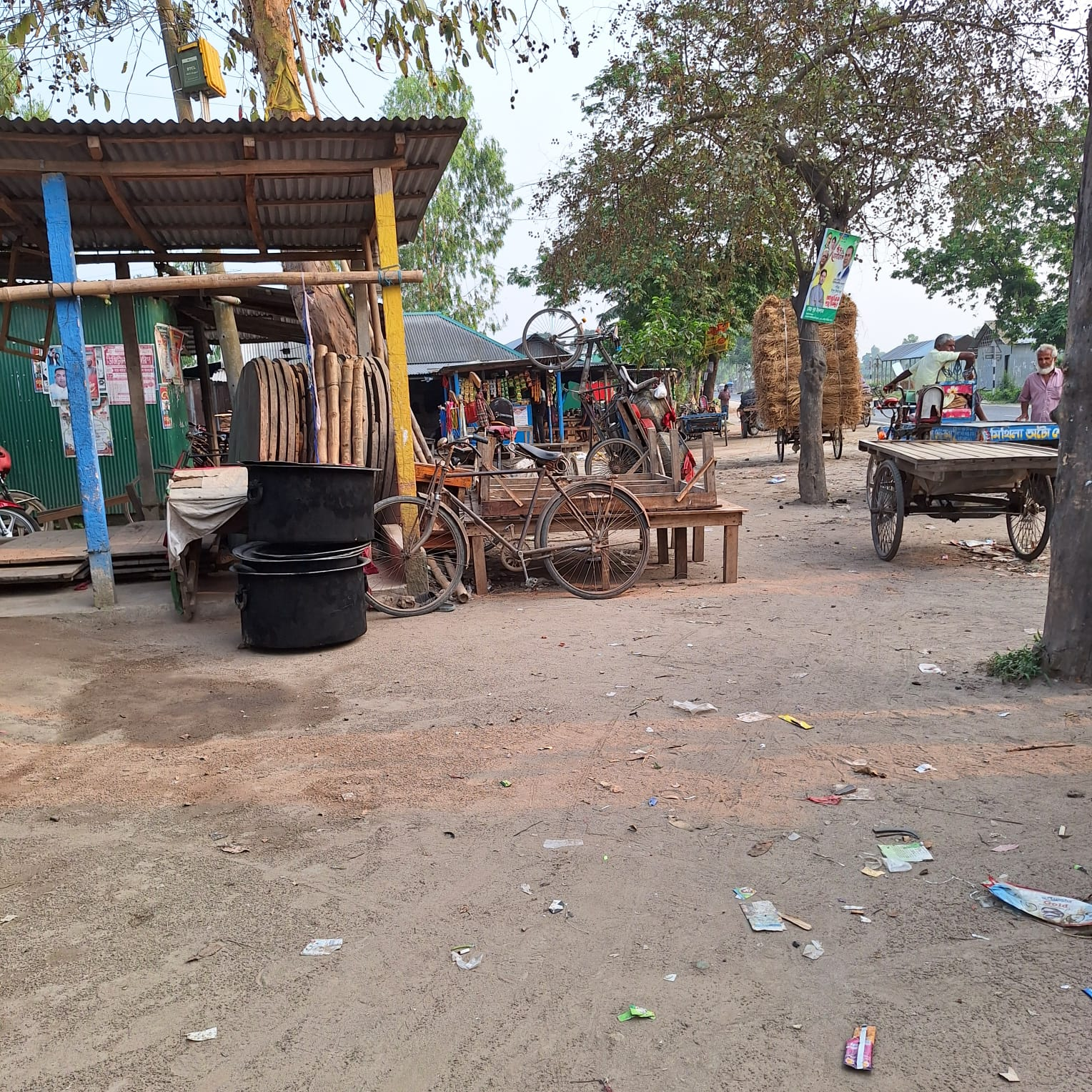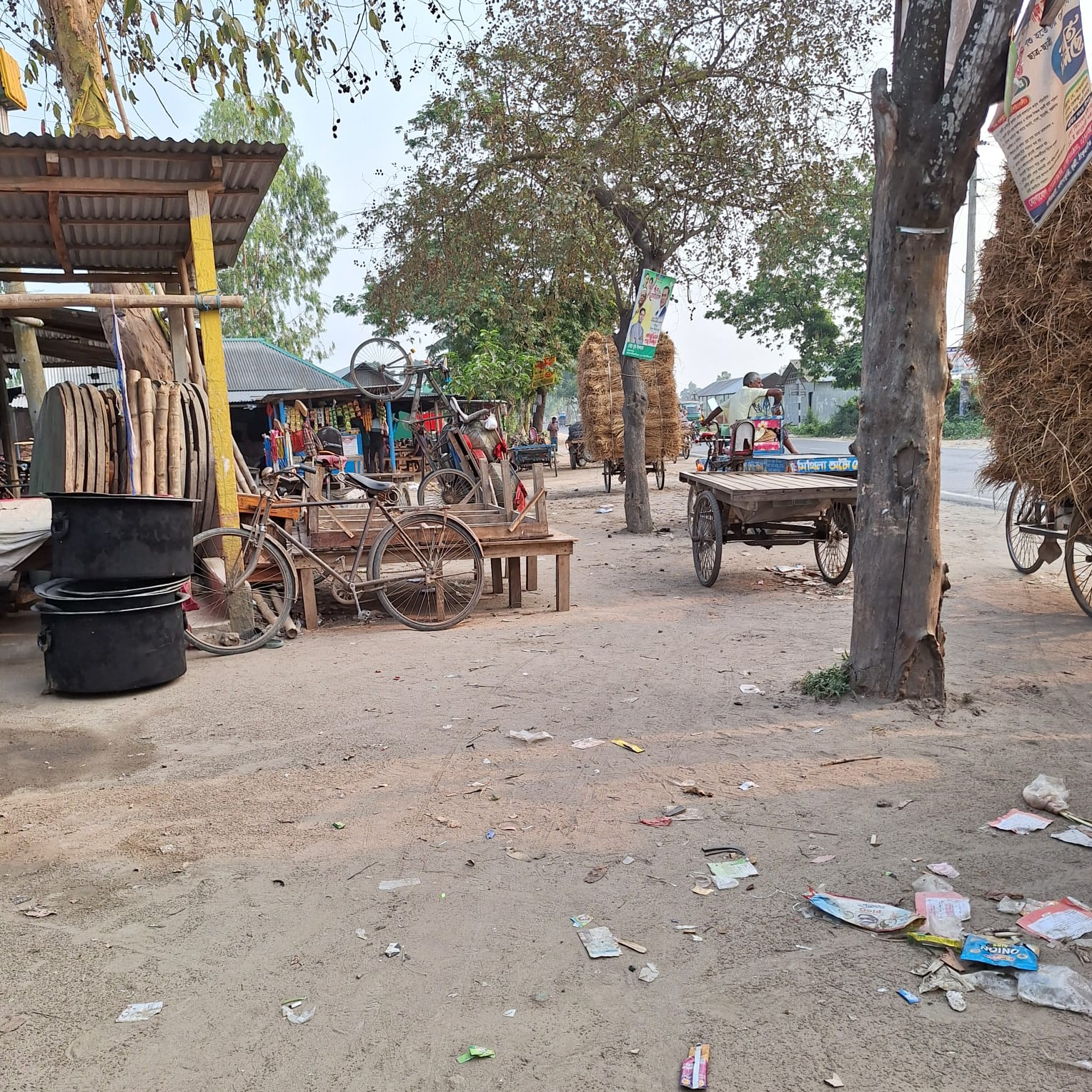On the right side, a van and a man are seen, indicating the transportation or sale of local goods. The presence of haystacks and trees in the background reflects the rural agricultural life. The atmosphere is calm, but the ongoing busyness of life is evident here. Garbage also indicates a common problem in rural areas—lack of environmental awareness. Nevertheless, the simplicity and daily hard work of the people have given this scene a special beauty.