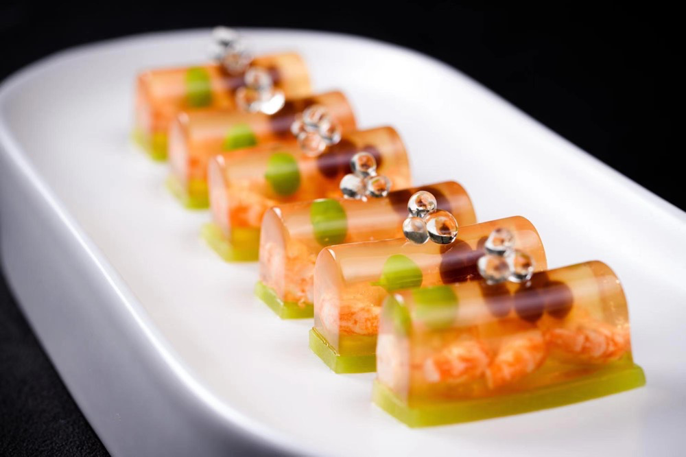 同样惊喜的,还有这份特别版的龙井虾仁,杨师傅把龙井茶汤特制成晶莹啫喱茶冻,龙井啫喱冻包裹着Q弹时令虾仁,表面点缀滴滴分子料理手法巧制的黑醋汁及柠檬醋汁,茶香虾嫩,偶尔吃上一口用崇明有机樱桃萝卜和内蒙扎蒙花油制成的口口脆,就像在舌尖上演一场春日派对。