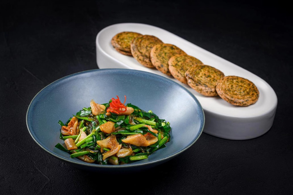 杨师傅还精选了崇明春天第一批红根韭菜,取竹蛏皇尖煎炒入味,放入少许台州豆面一同爆炒,搭配传统工艺制作的野菜葱油饼,别有趣味。区别于熟悉的海派油焖笋,杨师傅选用安吉春笋每日运送,清水先将春笋鲜甜味煮出后加入新鲜元贝,小火慢闷,元贝与春笋的甘甜巧妙融合,清甜而不腻。