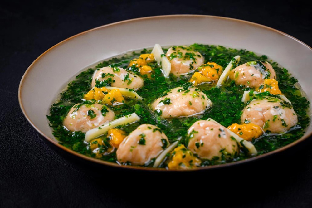 食春的派对,少不了荠菜、春笋、韭菜。如何把时令食材玩出新花样?这成了杨师傅一直在思考的问题。在有趣的“料理实验”中,他精选新鲜胖头鱼巧制成空心鱼面筋,将蛋白和牛奶调制成1:1比例注射进入鱼面筋中,入口如芙蓉爆浆,春令食材慢火炒制,佐以清鸡汤一同熬制而成的汤汁,汤汁的精华与香气渐渐渗入面筋中,一口咬下便是最好的春之味觉。