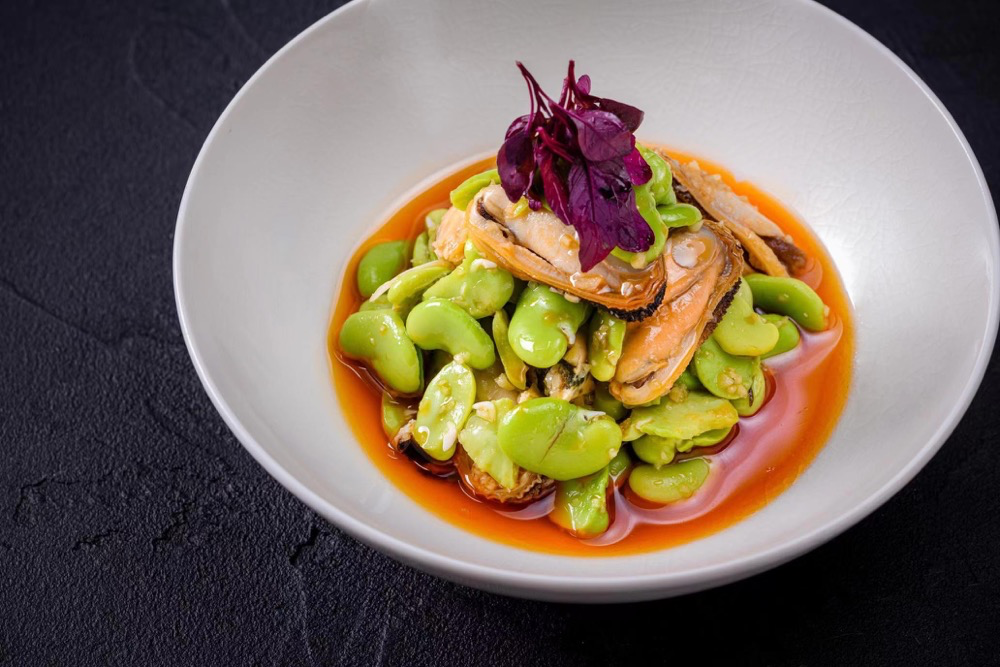 惊喜开场的是一道春日前菜,如山岚吹过的清风一样明朗而轻柔。杨师傅带回了江浙季节时令的蚕豆,以及台州肥厚鲜甜的青口贝,将焯熟的蚕豆瓣与青口贝放入碗底,慢慢淋入胡辣油炝拌制成的捞汁,让陆地与海洋的风味邂逅、缠绵,鲜香四溢又散发着春日的气息。