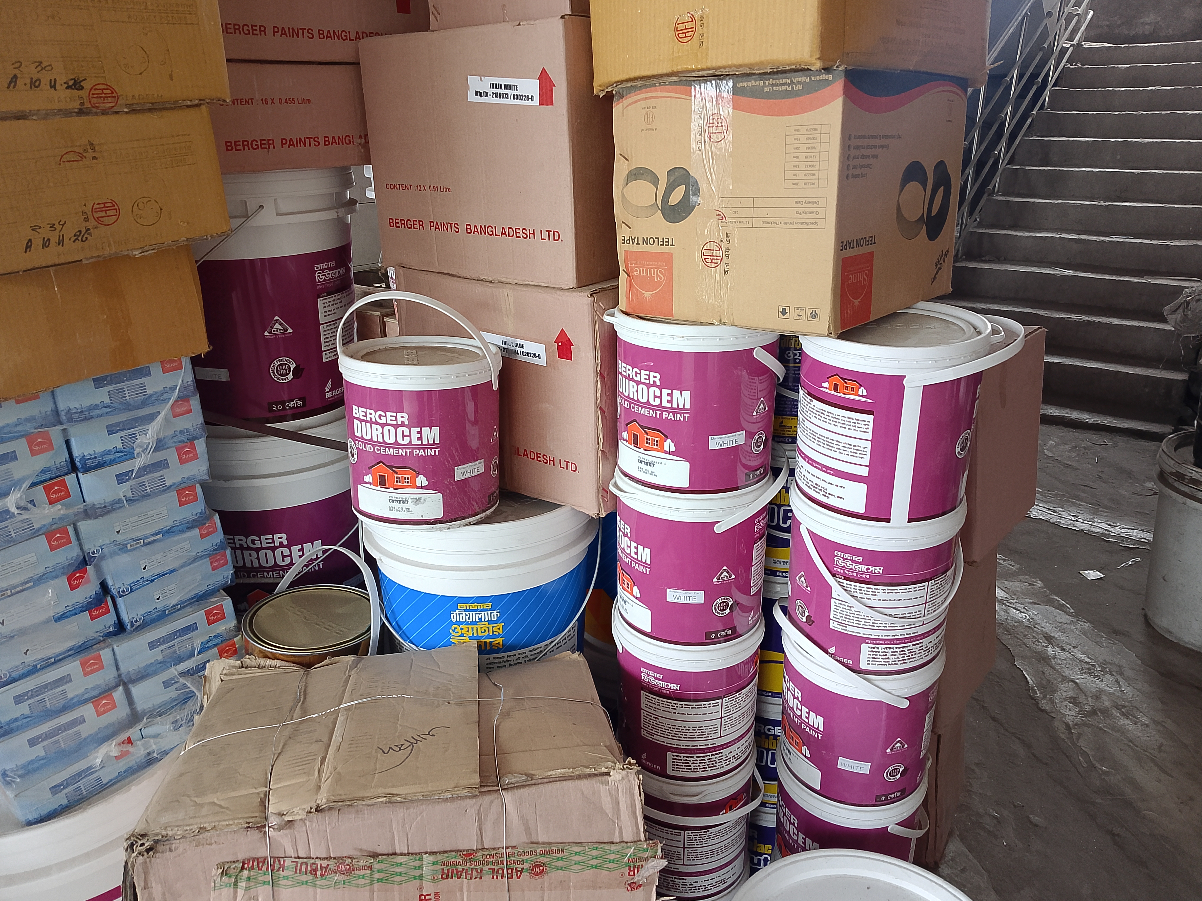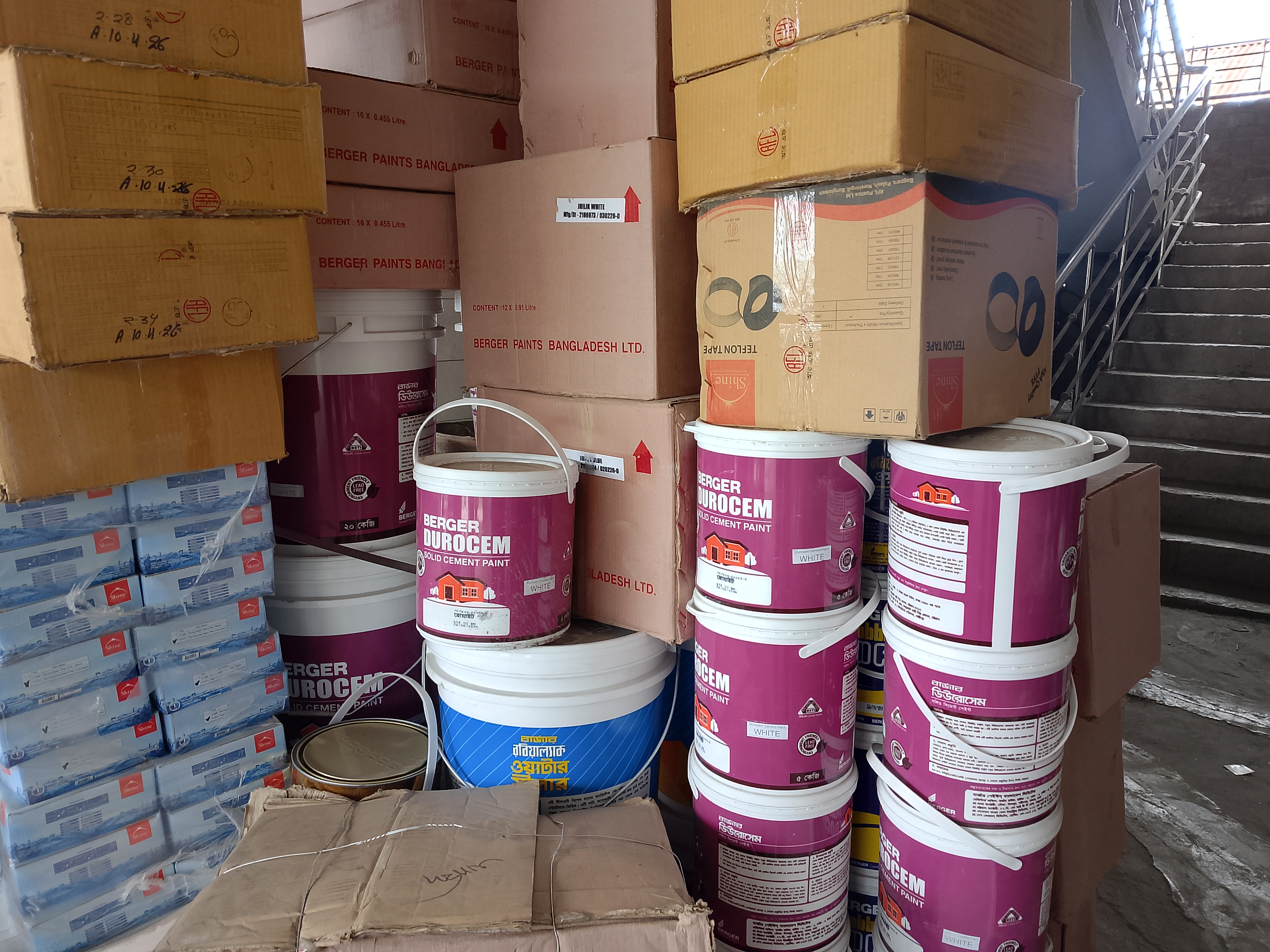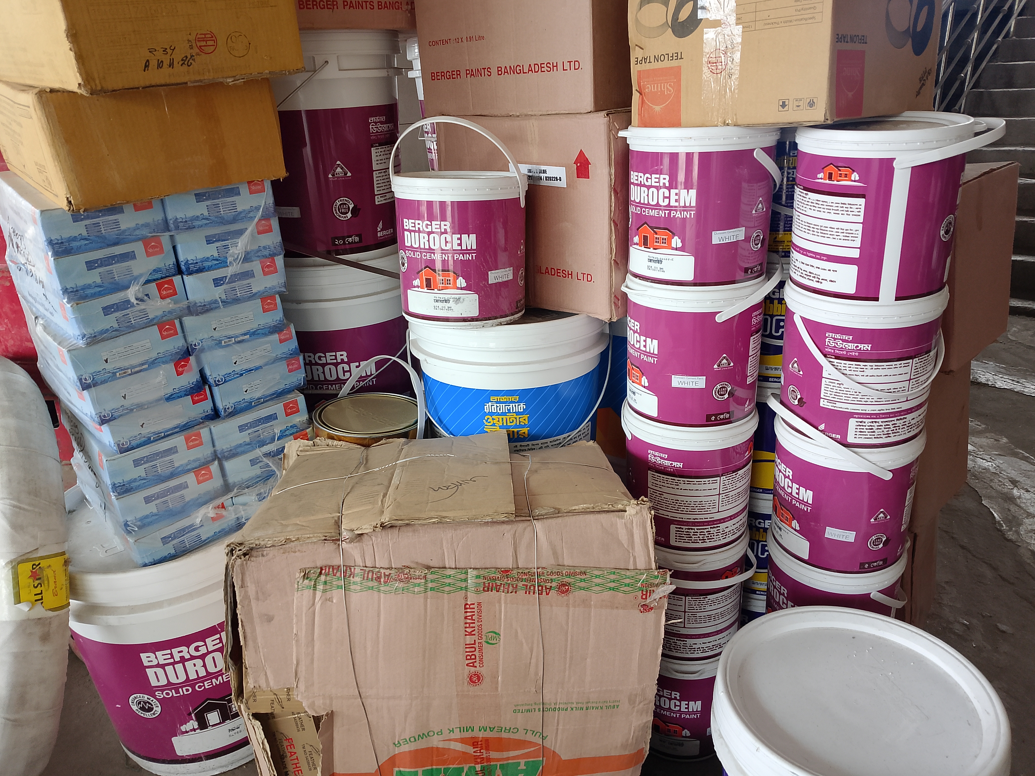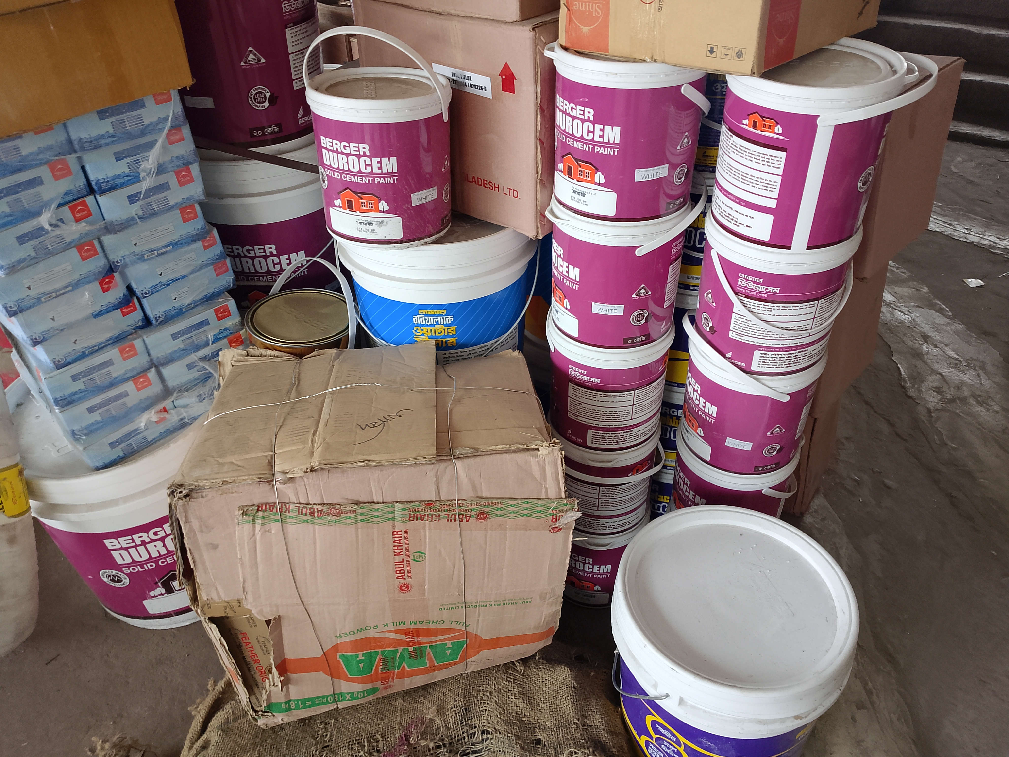There are paint containers here. There are many paints of different colors. It is written on the bottles and jerrycans which quality of paint each one is, and these labels are clearly written.