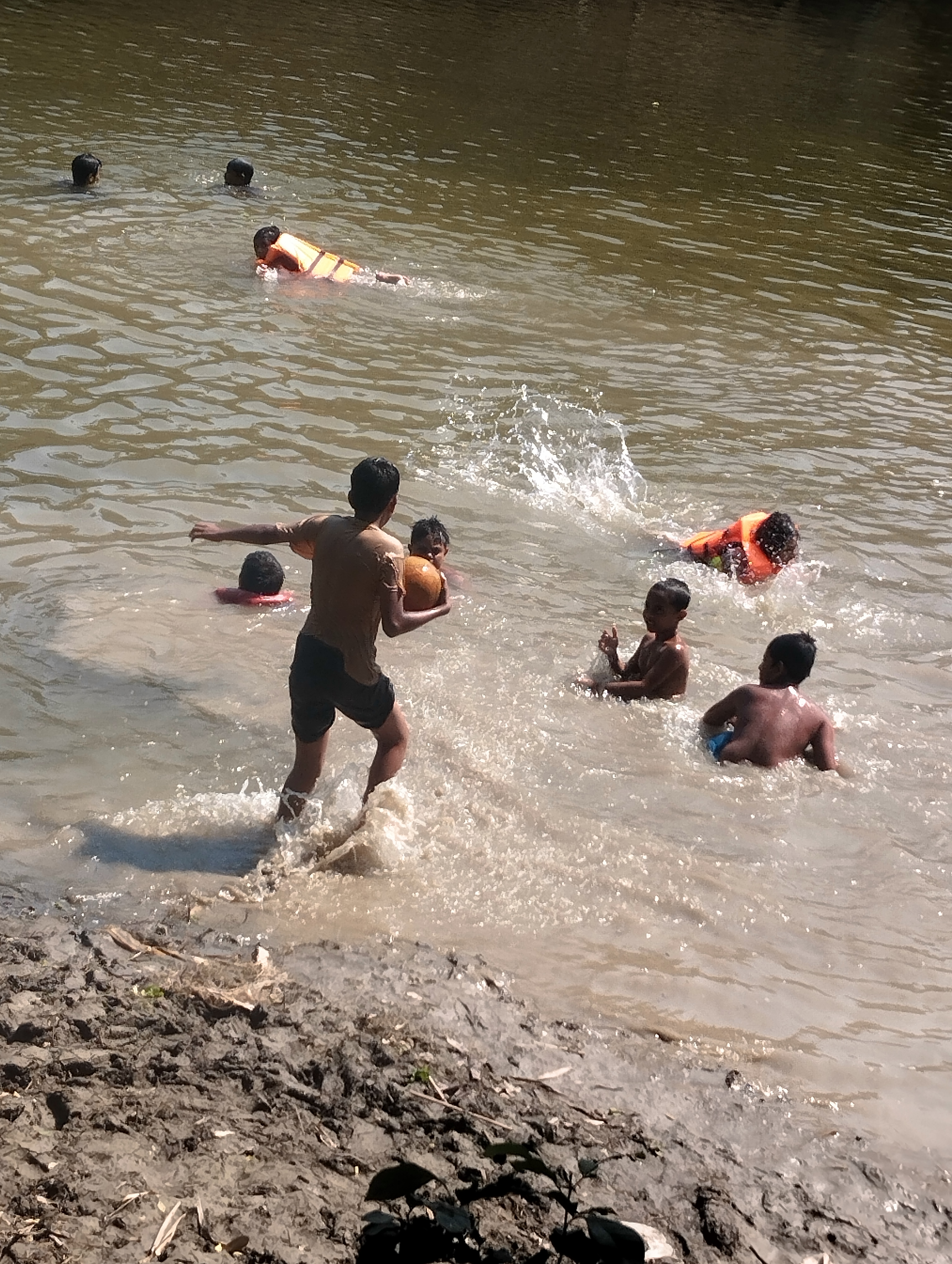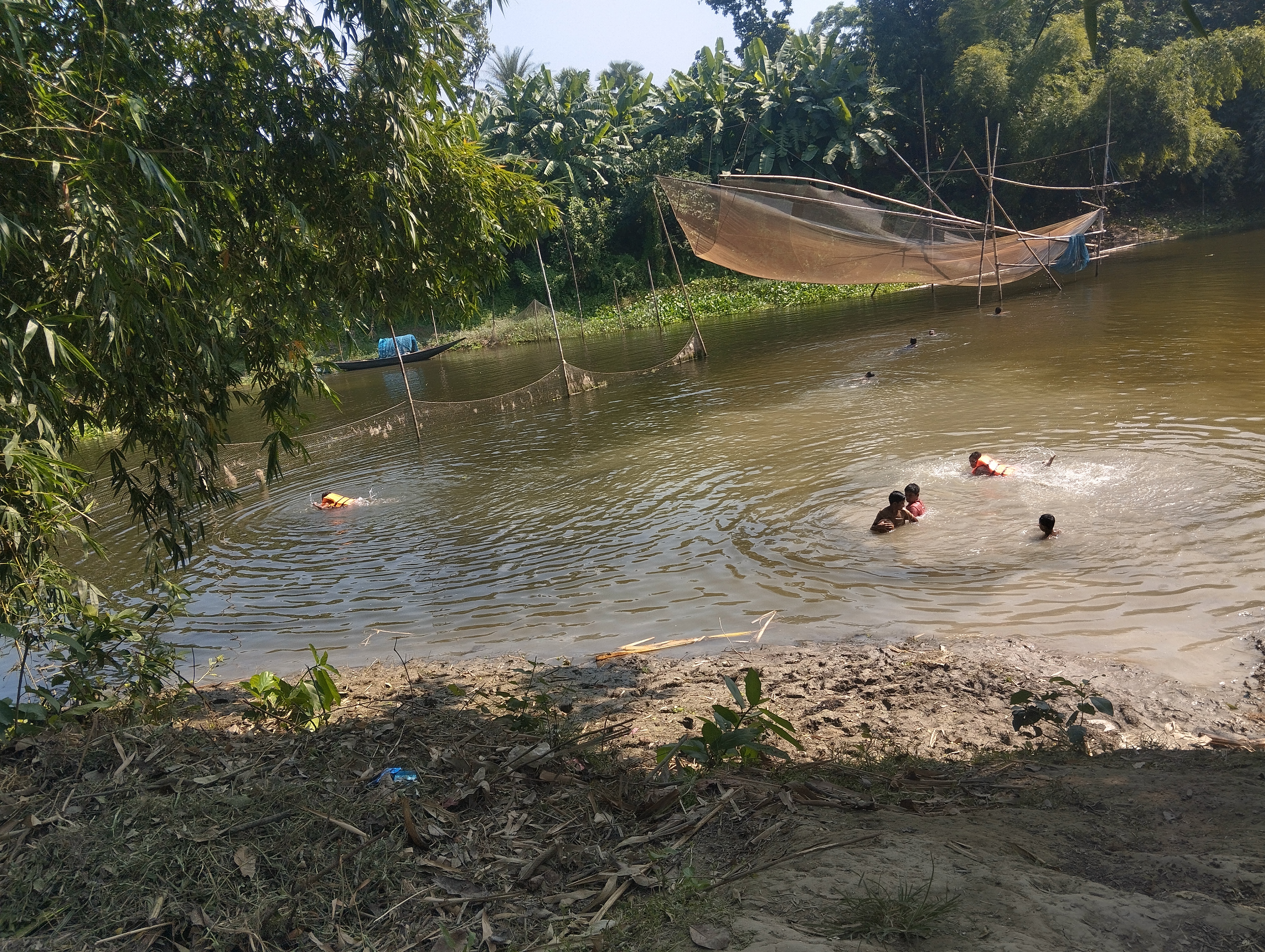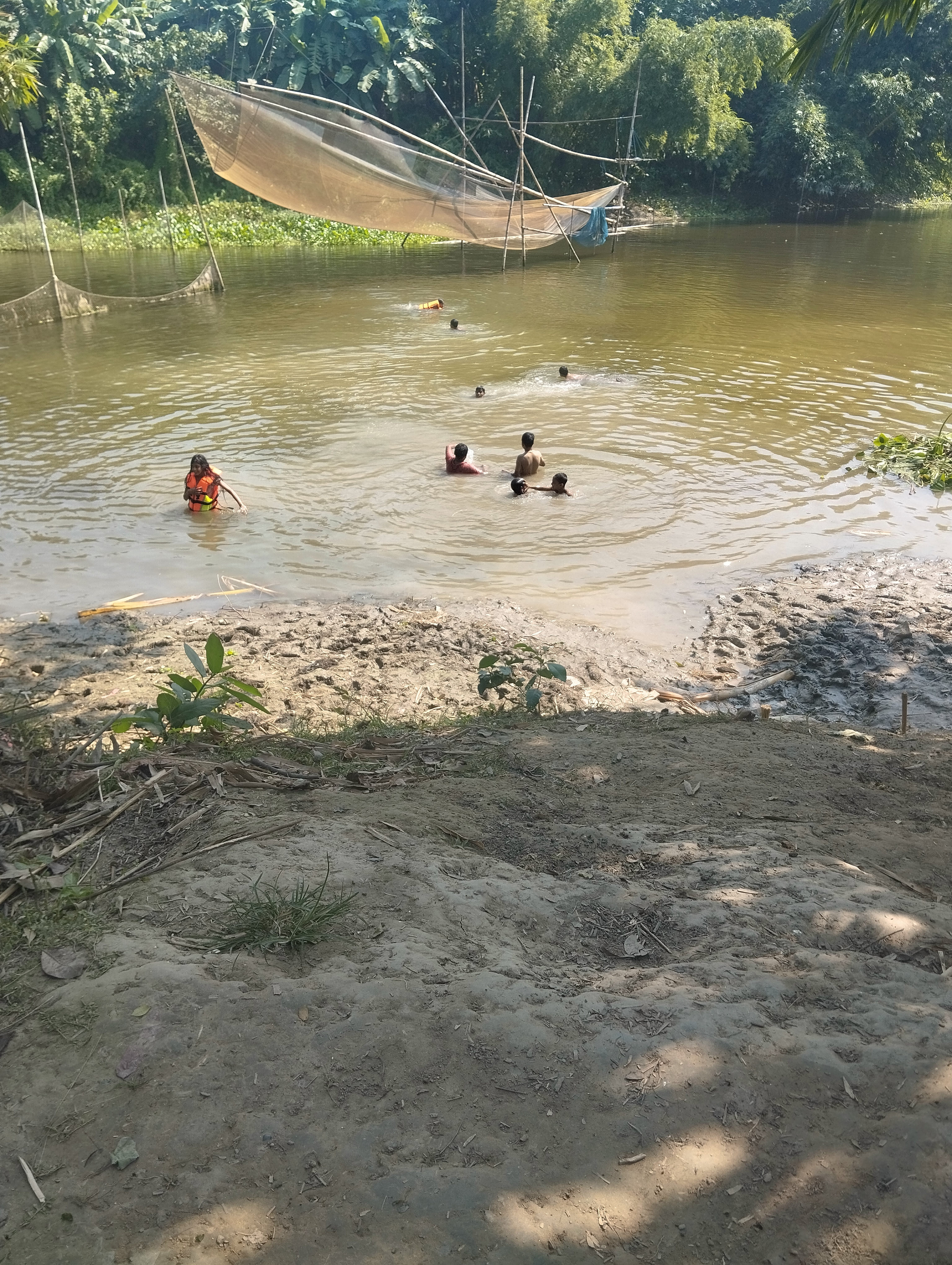 আবার নদীতে জাল দিয়ে মাছ ধরছে। যদিও দুপুর বেলা জেলে ভাই ছিল না। তবে বাচ্চারা তার জাল ধরে সাঁতার কাটছে। যাইহোক মাঝে মাঝে বাচ্চাদের নিয়ে গেলে ভালো মাছ ও পাওয়া যায়। তবে এভাবে সাঁতার কাটতে তারা অনেক আনন্দ অনুভব করে।আসলে আমরা যুগের সাথে সব পরিবর্তন হচ্ছে। যাইহোক এভাবে যেন তারাতাড়ি বাচ্চাদের সাঁতার শিখাতে পারি। সবাই দোয়া করবেন বাচ্চাদের জন্য।