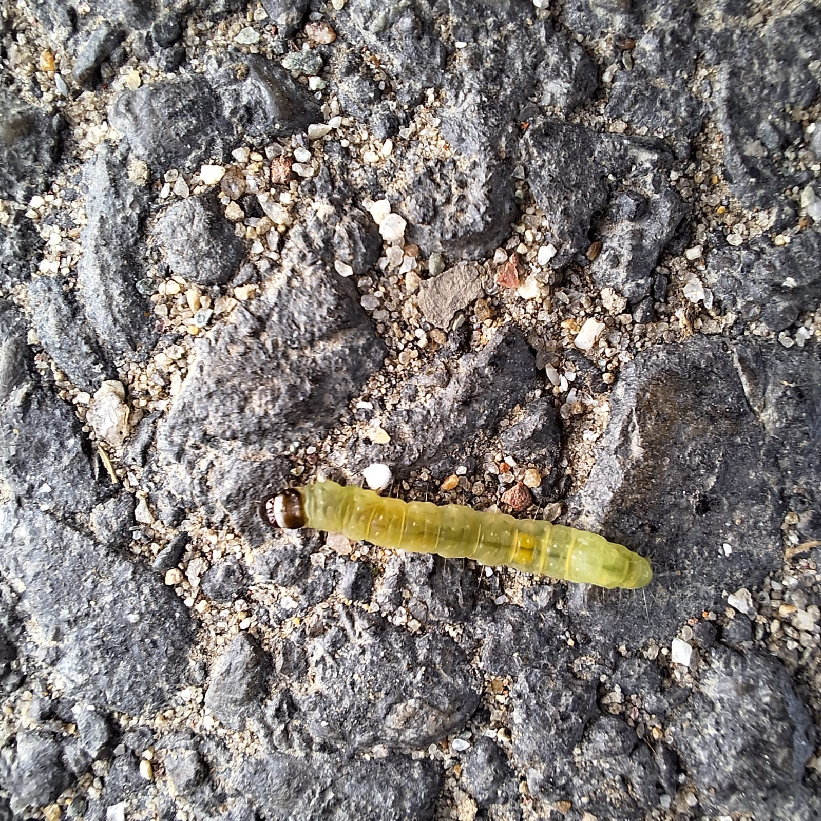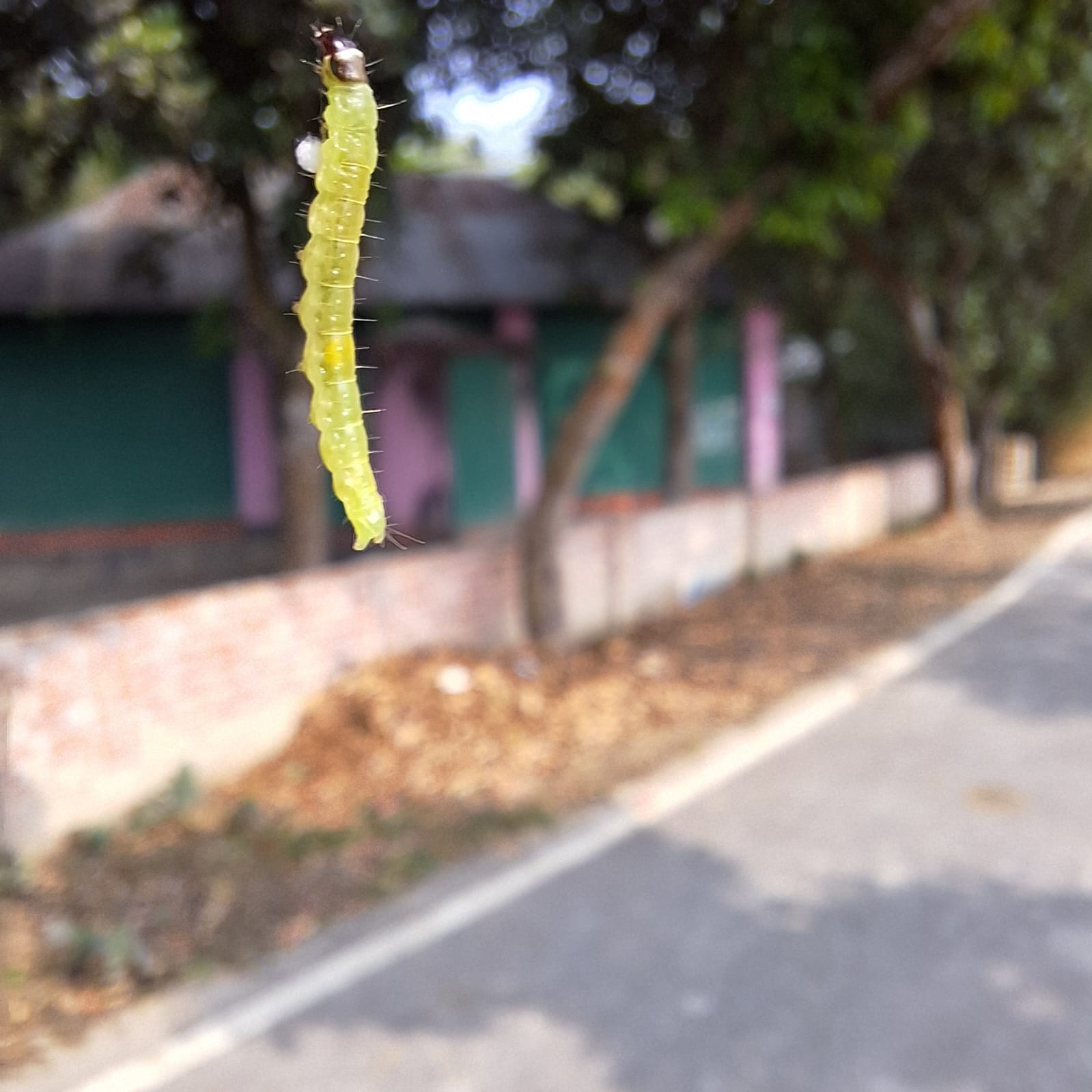 A unique moment in the tiny world of nature is captured in this macro photo. In the photo, a bright green caterpillar is seen hanging in the air with the help of a thin silk thread. The fine hairs and body parts on its transparent body are clearly visible, which highlights the value of macro photography.