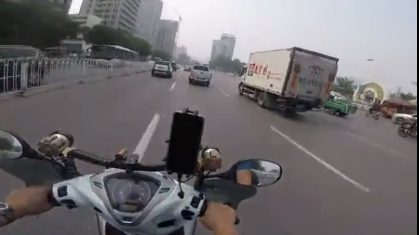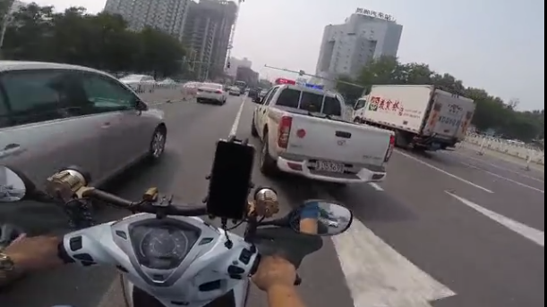 视频中先出现的是一辆摩托车,正在驾驶中。