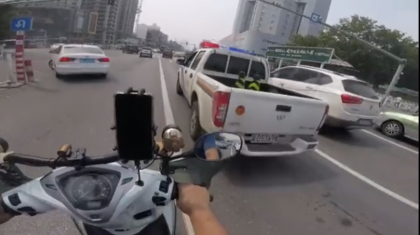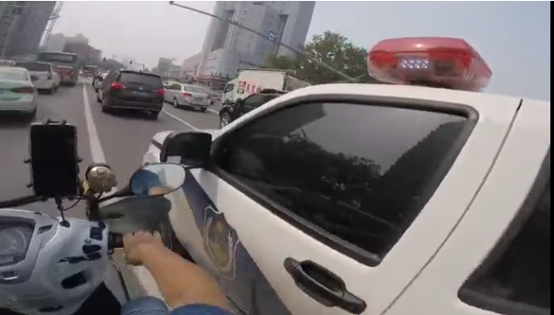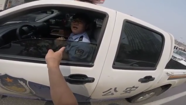 待红灯前停下时,男子用手敲了敲警车的驾驶员玻璃,随后玻璃摇下,出现一位身穿民警服装的驾驶员,一脸不解的样子。