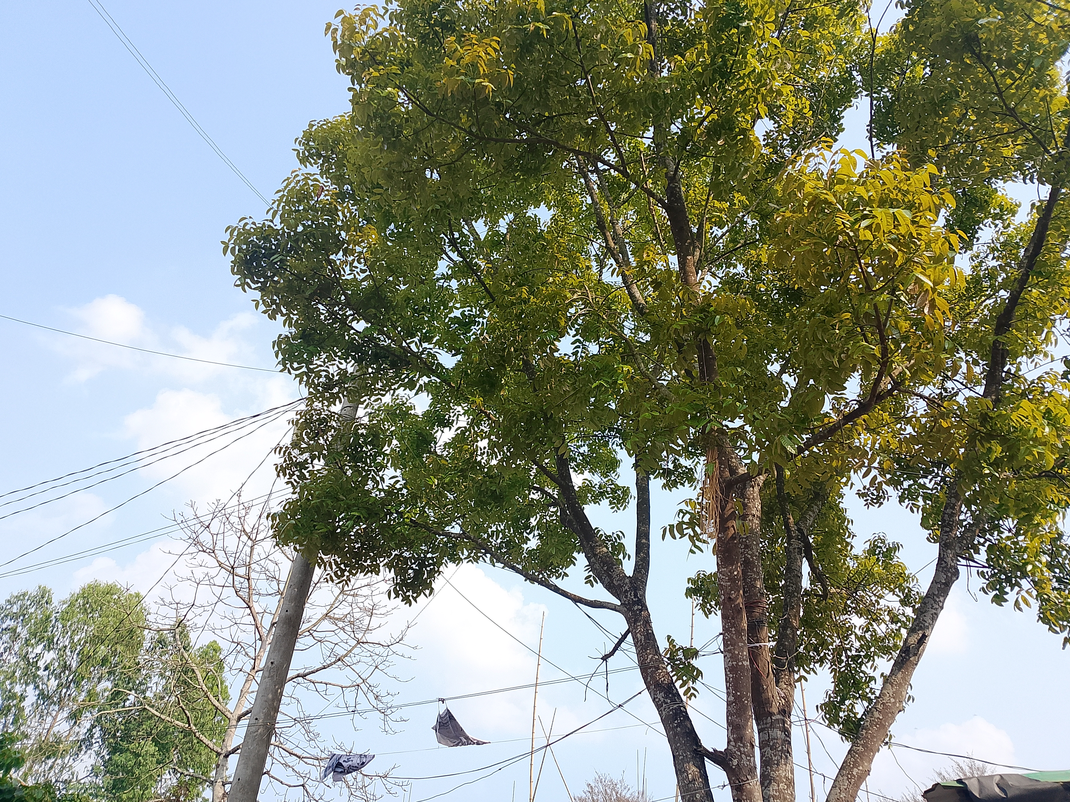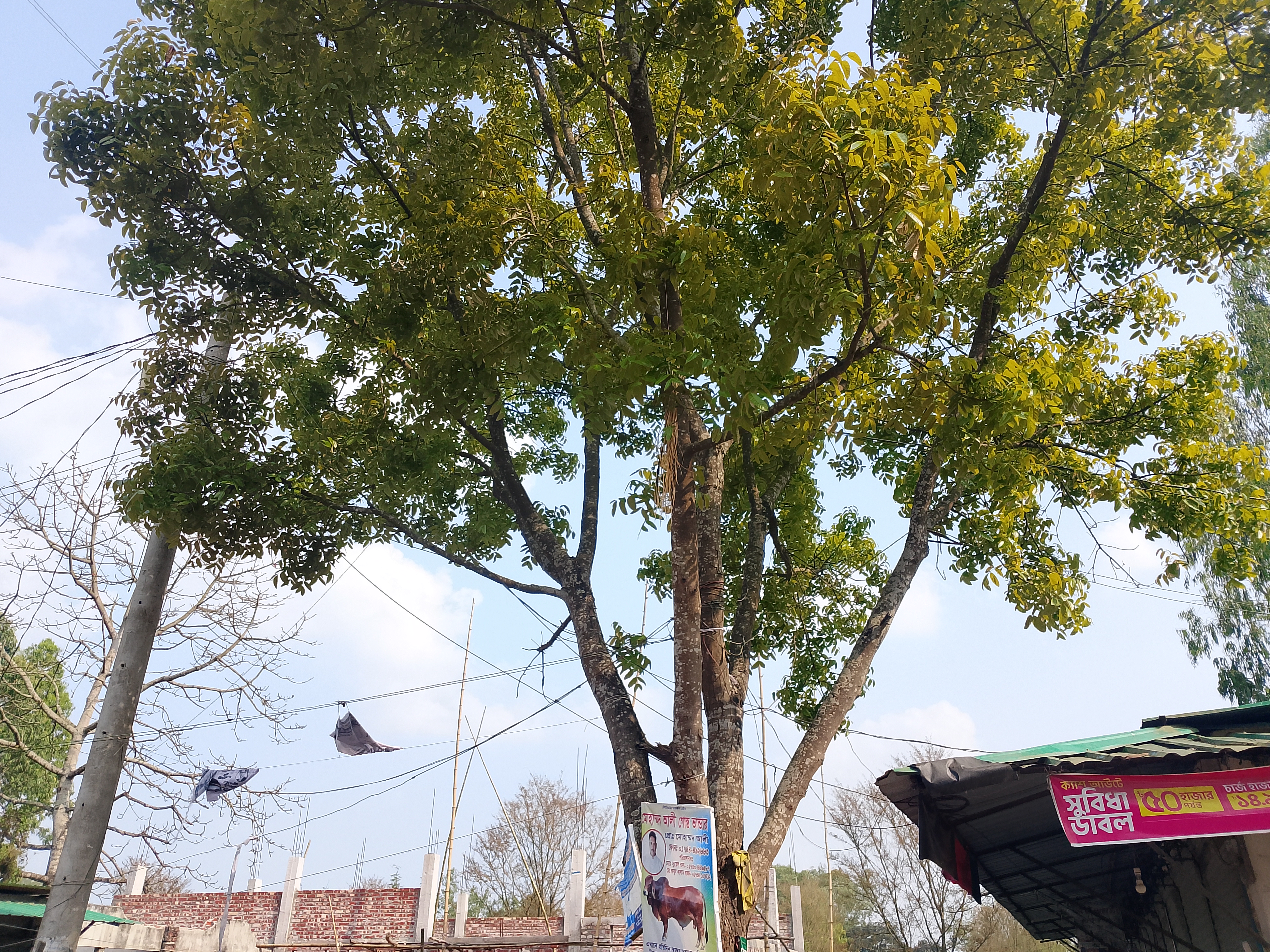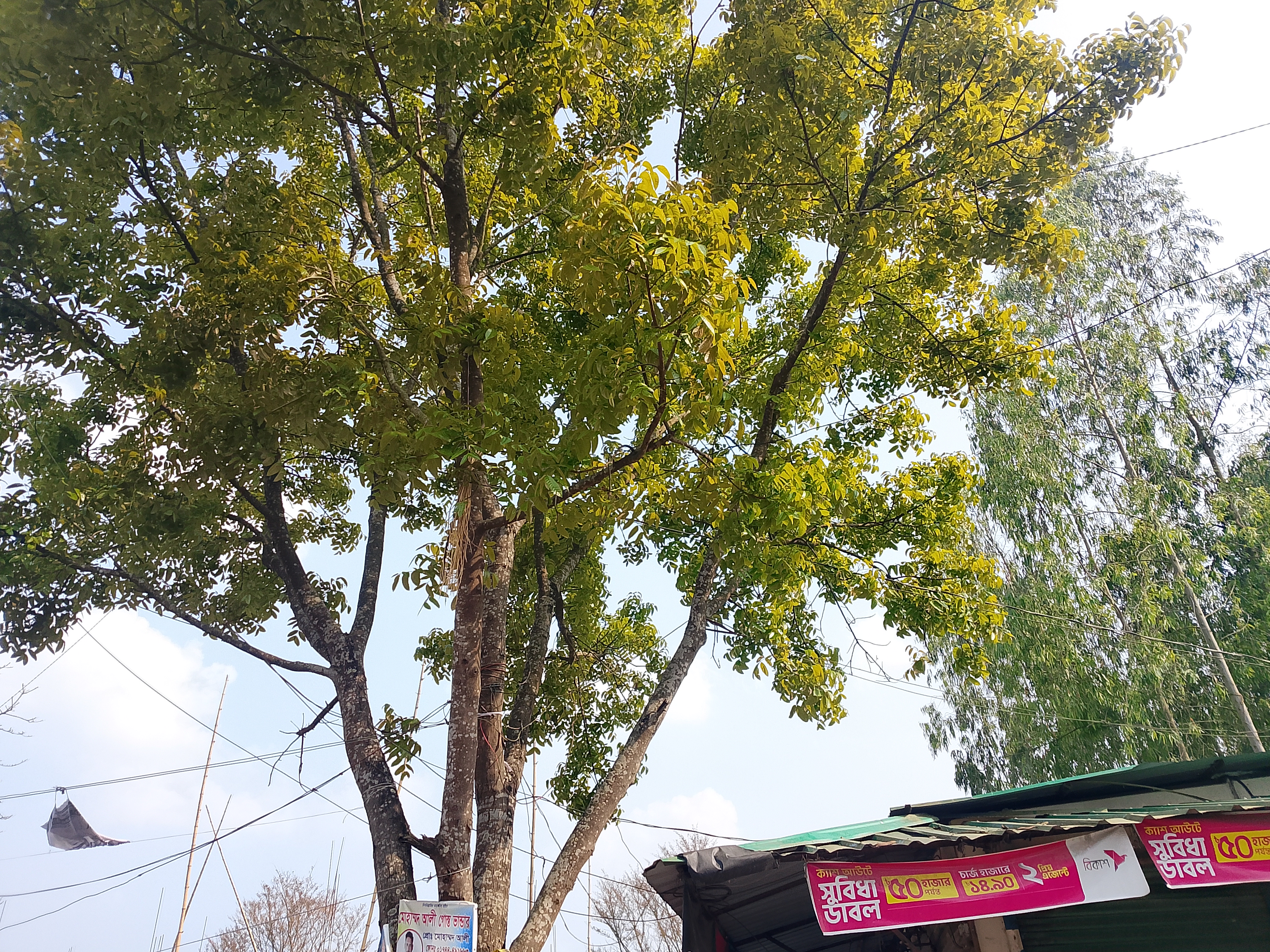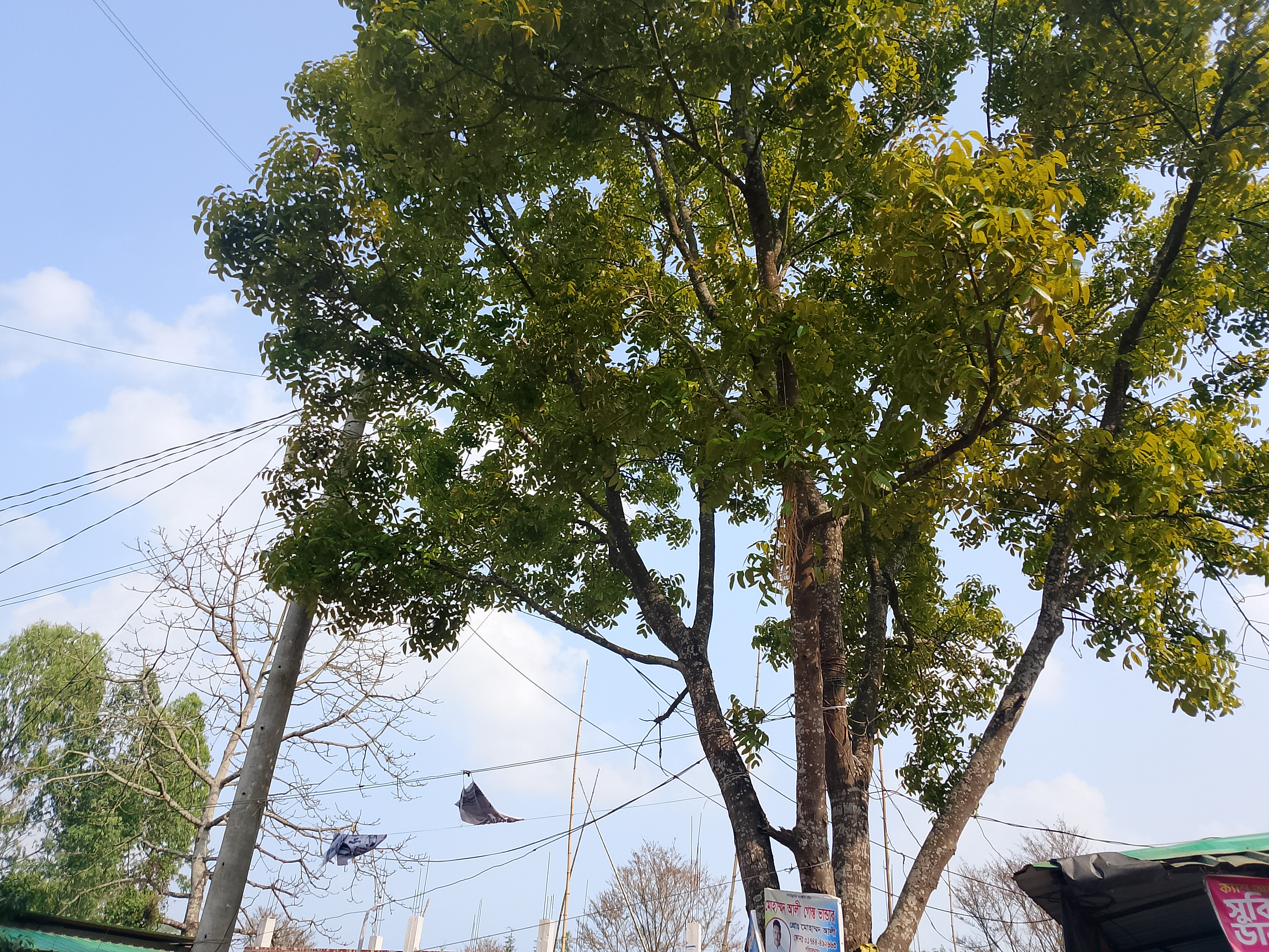 এখানে একটি বিশাল গাছ আছে যার ডালপালা সবদিকে ছড়িয়ে আছে। গাছটিতে অনেক ছোট ছোট পাতা আছে, এবং সেগুলো স্পষ্টভাবে দেখা যায়। অনেক বড় পাতাও আছে, যেগুলো দেখতে খুব সুন্দর। এটি একটি বিশাল গাছ যার ডালপালাগুলো চওড়া এবং পাতাগুলো আকর্ষণীয়। এরকম জায়গায় এই ধরনের গাছ দেখতে খুব সুন্দর লাগে। এটি এলাকাটির সৌন্দর্য বাড়িয়ে তোলে, কারণ এটি একটি ব্যস্ত জায়গা যেখানে মানুষের আনাগোনা রয়েছে, এবং এখানে এই গাছটি থাকায় জায়গাটি আরও সুন্দর হয়ে উঠেছে। আমি সেখানে গিয়েছিলাম এবং ফেরার পথে সেই জায়গাটির কিছু ছবি তুলেছিলাম, যা এখন আপনাদের সাথে শেয়ার করছি।