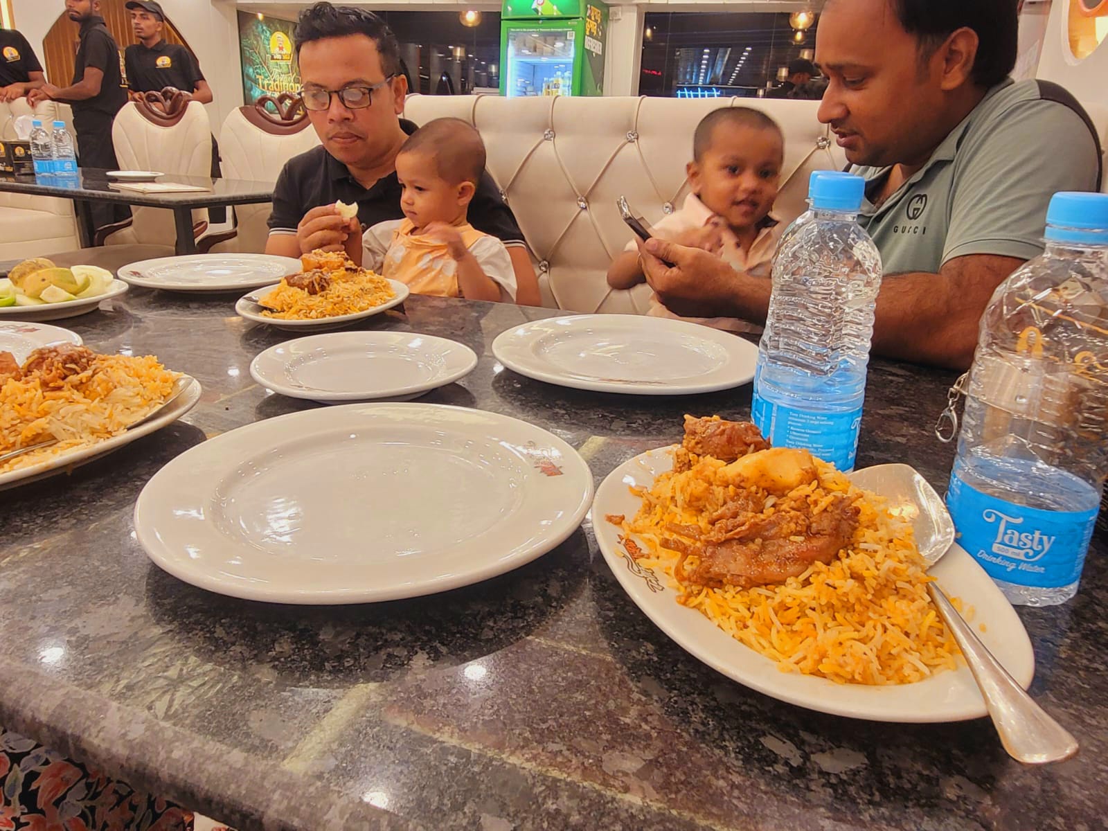 খাবার অর্ডার করার কিছুক্ষণের মধ্যেই খাবার দিয়ে গেল আর সবাই যেহেতু আলাদা আলাদা টেবিলে বসেছে সেই হিসেবে সবার খাবার ধীরে ধীরে দিতে দিতে এদিকে আমরাও কিছু ফটোগ্রাফি করলাম। আসলে এই কাচ্চি দেখলে সবারই লোভ লাগে। আর আমার তো খুব পছন্দের। আমি নিজেই বাসায় কয়েকবার তৈরি করেছি। রেস্টুরেন্টের কাচ্চি খেয়ে মনে হল আমার বাসার কাচ্চি তাদের থেকে কোন অংশে কম ছিল না। নিজের প্রশংসা যদিও করছি না তবুও বললাম আর কি হাহাহা।