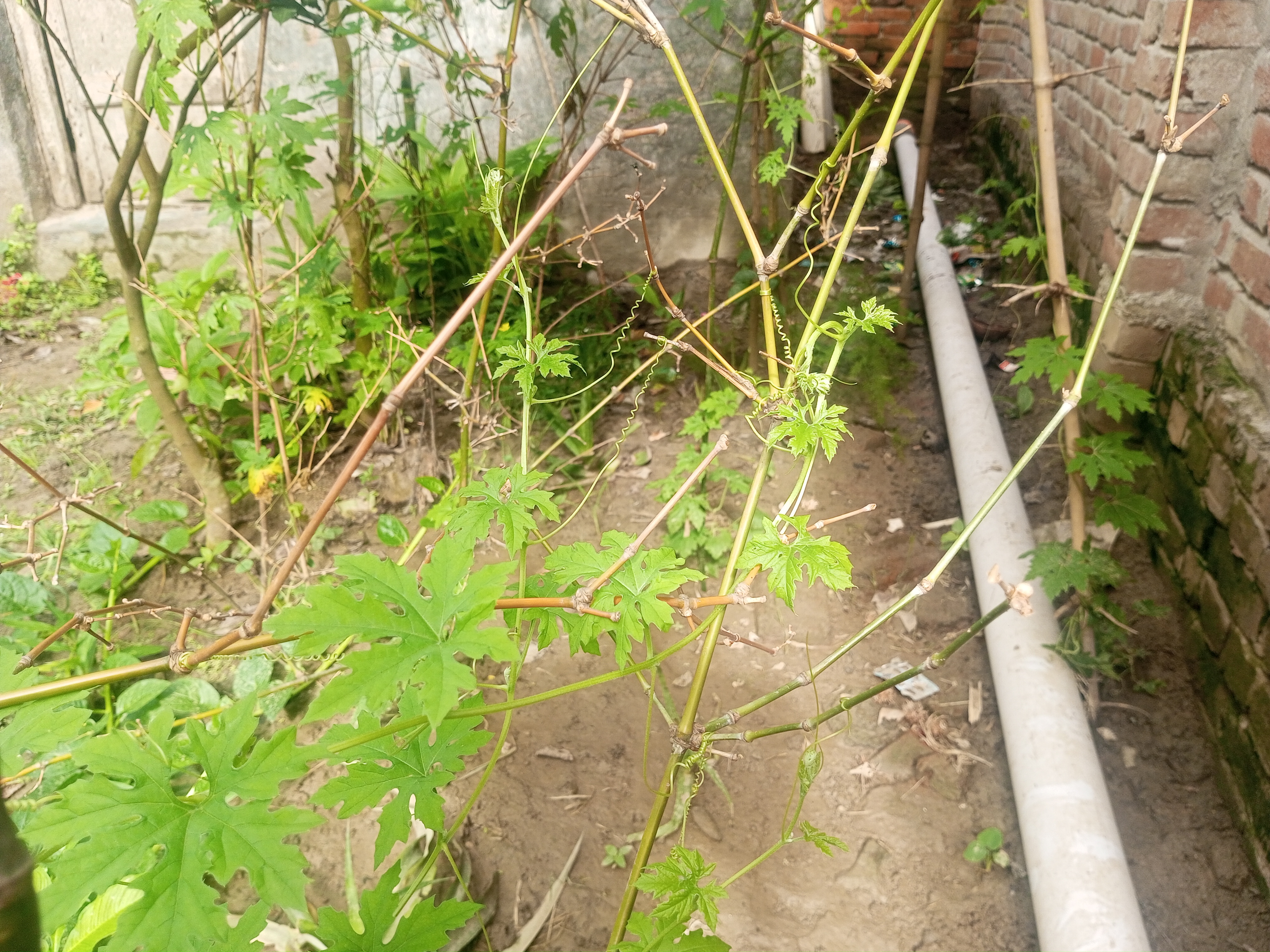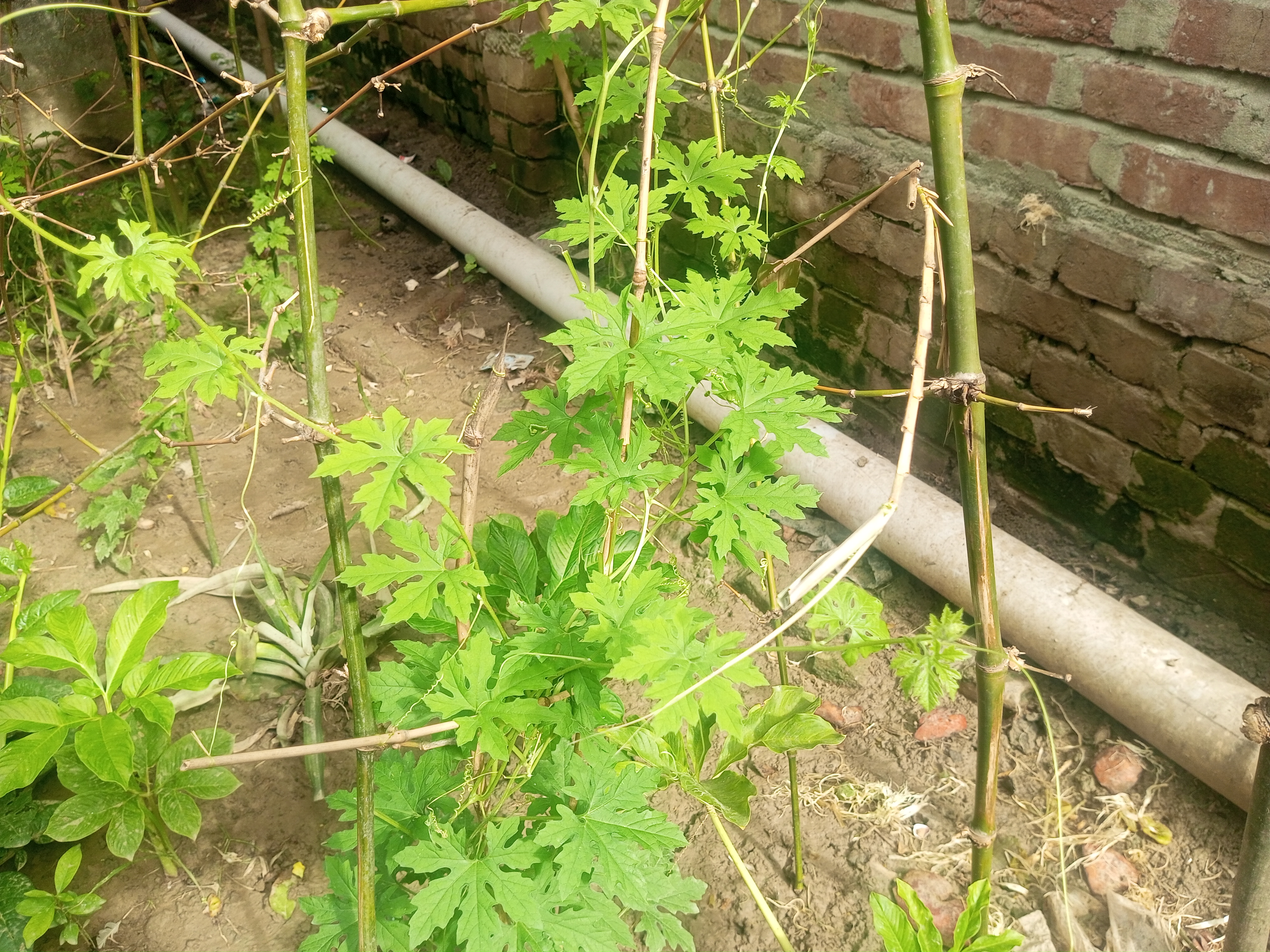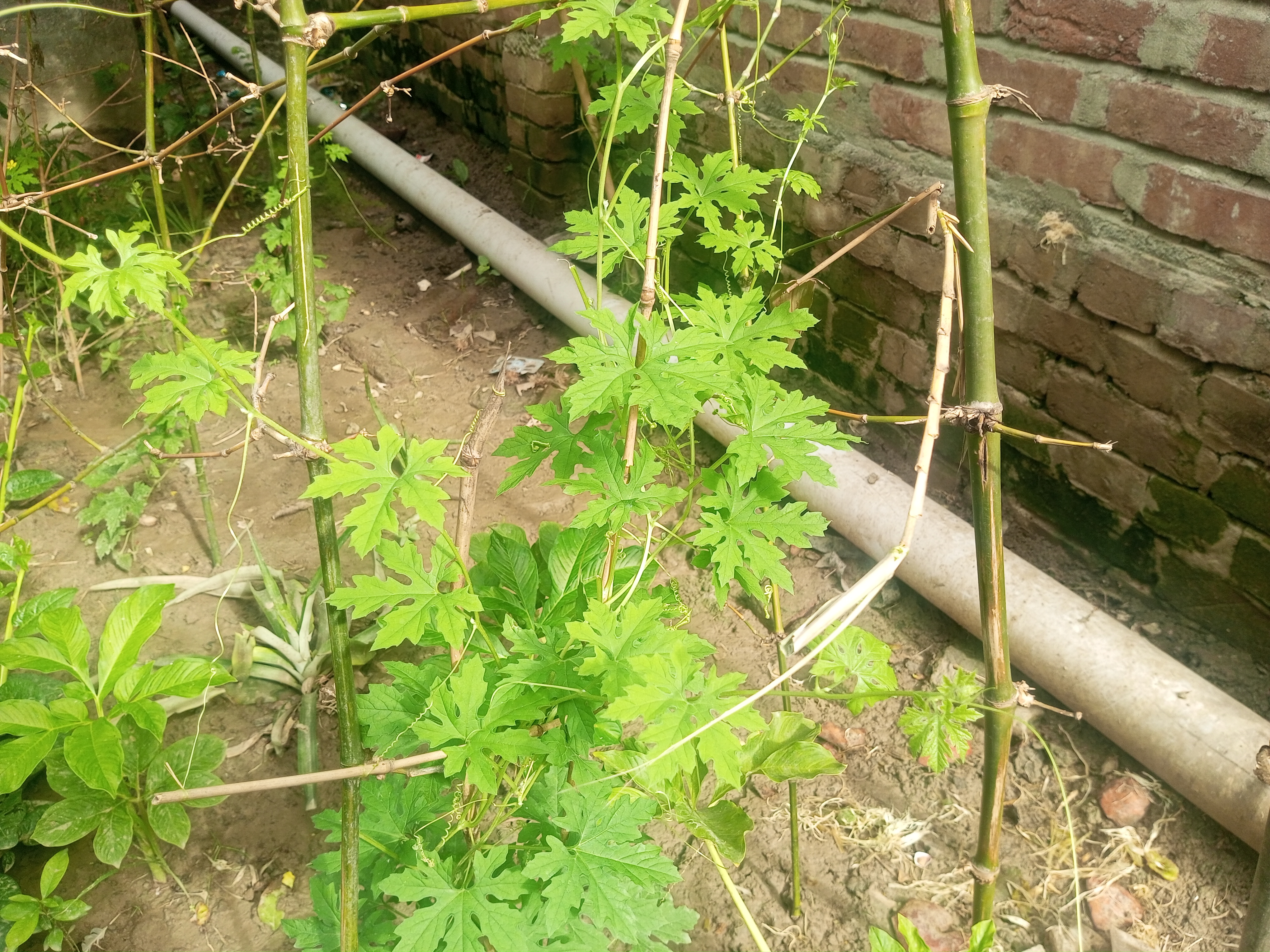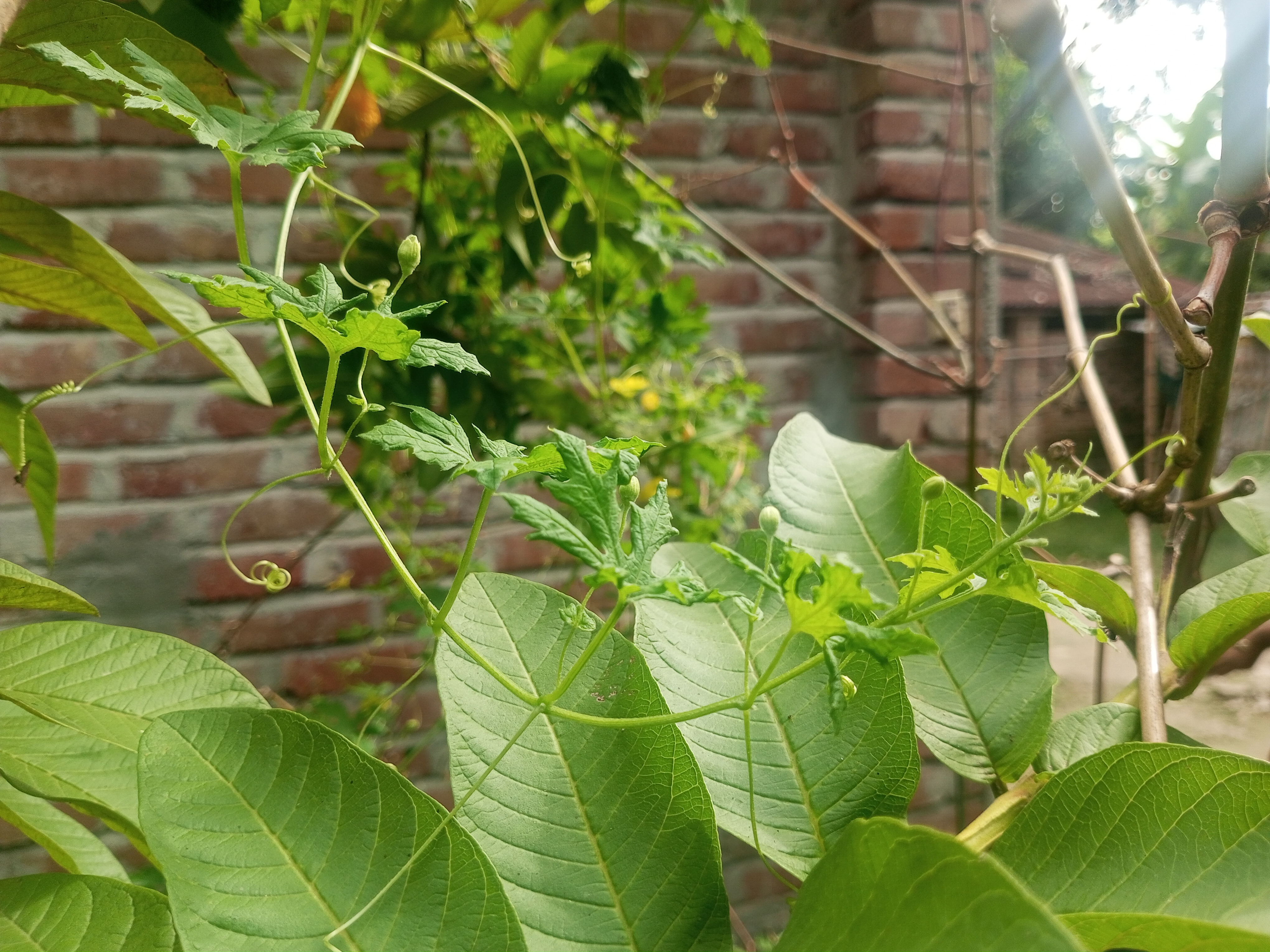 বেশ কিছুদিন আগে আমার ঘরের পাশে নতুন মাটি দিয়েছিলাম। কারণ এখানটায় কাজ করা হয়েছিল তাই মাটি অনেকখানি কমে গেছিল। নতুন করে লাল মাটি দেওয়ায় জায়গাটা বেশ সুন্দর দেখা যাচ্ছিল। হয়তো কেউ এই সুন্দর জায়গায় করলার বীজ ফেলেছে অথবা কোন ভাবেই এই জায়গায় করলার বীজ এসেছে। আমরা সকলে জানি বেশ কিছুদিন ধরে বৃষ্টি হচ্ছিল না, তাই আমরা বৃষ্টি পানি পাওয়ার জন্য বেশ আর্তনাদ করছিলাম। হঠাৎ বৃষ্টির পানি আমাদের মাঝে পড়তে শুরু করেছিল আর ঠিক তার পরেই আমি লক্ষ্য করেছিলাম ঘরের পাশে দেওয়া এই লাল মাটির বুকে বেশ কিছু করলার চারা জন্মাতে থাকলো। আমি বেশ কিছুদিন ধরে এই করলার চারাগুলো লক্ষ্য করতে থাকলাম। যখন দেখলাম একটু বড় হতে শুরু করেছে তখন বাশঝাড় থেকে কিছু বাঁশের কঞ্চি এনে গাছগুলোর পাশে পুতে দিলাম আরো বৃদ্ধি পাই যেন, বৃদ্ধি পেতে সহজ হয় সেই আশায়। যাইহোক চারা গুলোর পাশে কুঞ্চি পুতে দেওয়ার পরে গাছগুলো এই কুঞ্চি বেয়ে উপরে ওঠা শুরু করলো এবং বৃদ্ধি পেতে থাকলো। এমন দৃশ্য দেখে বেশ ভালো লাগছিল আমার যাইহোক গাছগুলো বৃত্তি পাওয়ার সুযোগ করে দিলাম কিছু করলা ধরবে সেই আশায়। সৌন্দর্য দেখে যখন মুগ্ধ হয়ে ছিলাম ঠিক তখনই চেষ্টা করেছিলাম কিছু ফটোগ্রাফি করে রাখার।