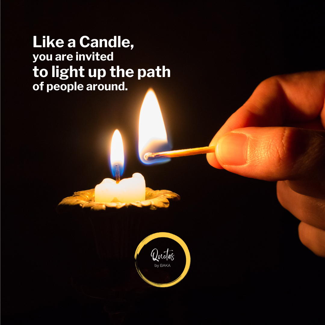 Light up!quotesbybaka (25)in #lightup • 3 years ago Like a candle, you are invited to light up the path of people around. #light #people #motivation #leader #leadership #readtolead #lead