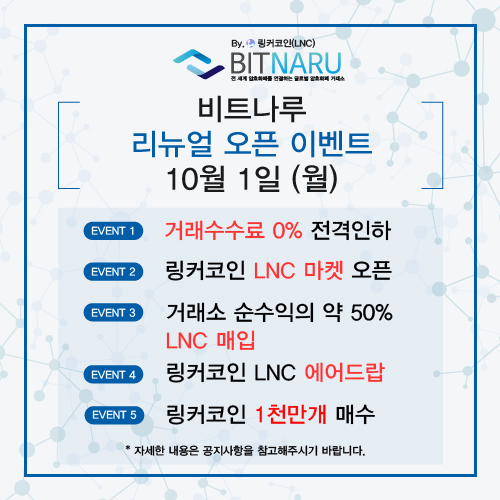 리뉴얼 오픈 이벤트 네 번째인 <비트나루 & 링커코인 입소문내면 LNC 에어드랍>의 내용을 공개합니다.