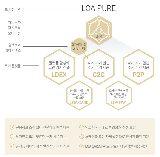 이들은 플랫폼에서 서비스하는 카테고리로서 신용정보 조회 없는 대출, 스테이블 코인으로 전세계 화폐 지원 등 현 금융시장의 문제점을 해결하고자 많은 고민을 한 흔적이보이는 영역이다. 이와 함께 LOA CARD와 PAY를 지원해 실생활에 적용하겠다하는 오프라인 생태계 구축도 지원한다고하니, 세계적으로 활발히 이뤄지는 블록체인 실생활화 진행도 함께 준비함으로써, 여러 방면에서 긍정적으로 생각해볼만 합니다.