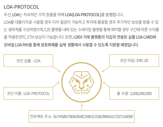 해당프로젝트의 로아 생태계를 구성하는 요소는 LDEX,C2C,P2P,LOA CARD,LOA PAY등이 있는데 몇가지를 설명을 하도록하겟습니다.