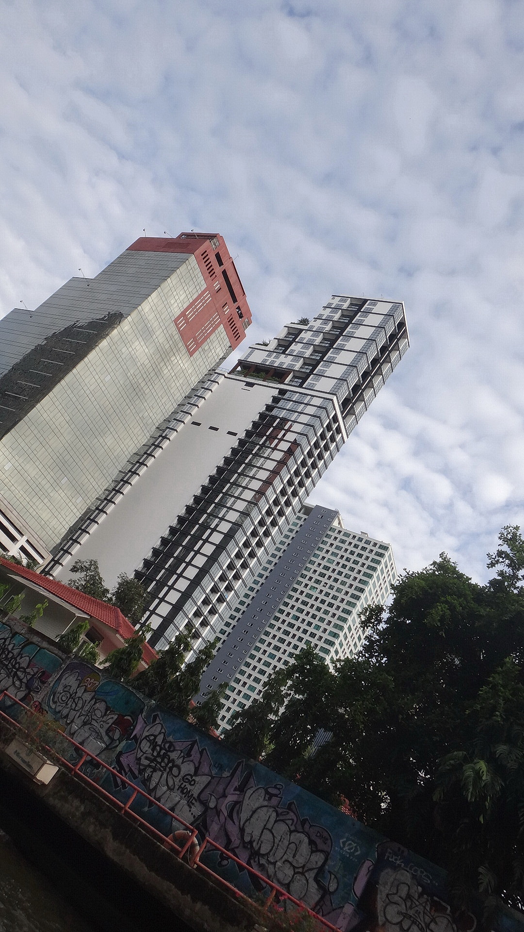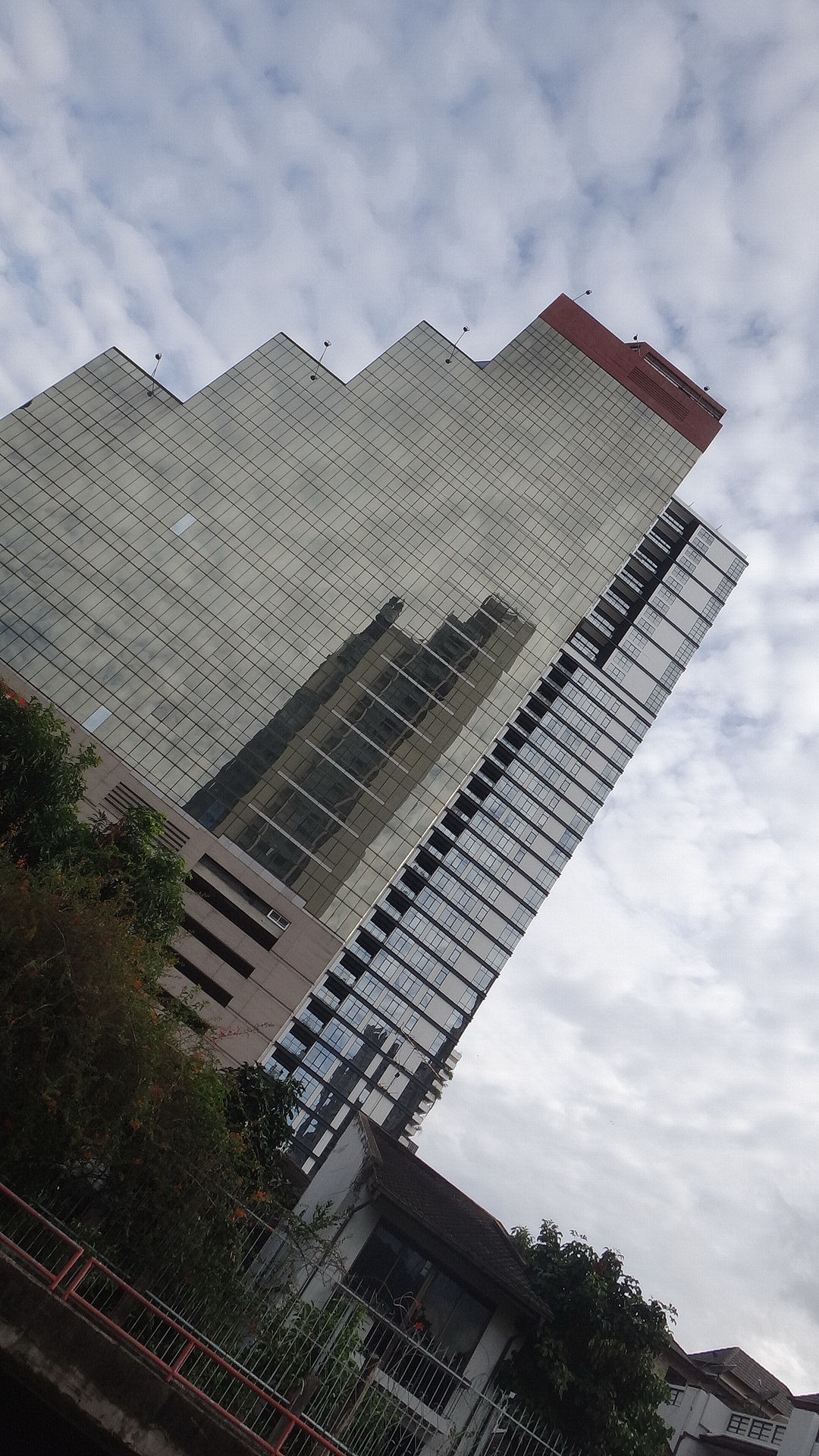 These photos i actually was snapping as i was traveling in the taxi boat along the Bangkok canal i had center view of skyscrapers and condominium apartments on either side of the canal i even caught the young girls head with her helmet on they are the young girls that walk on the railing of the boat on the outside collecting your fare wouldn't want to fall of the edge the canal is not exactly that clean.
