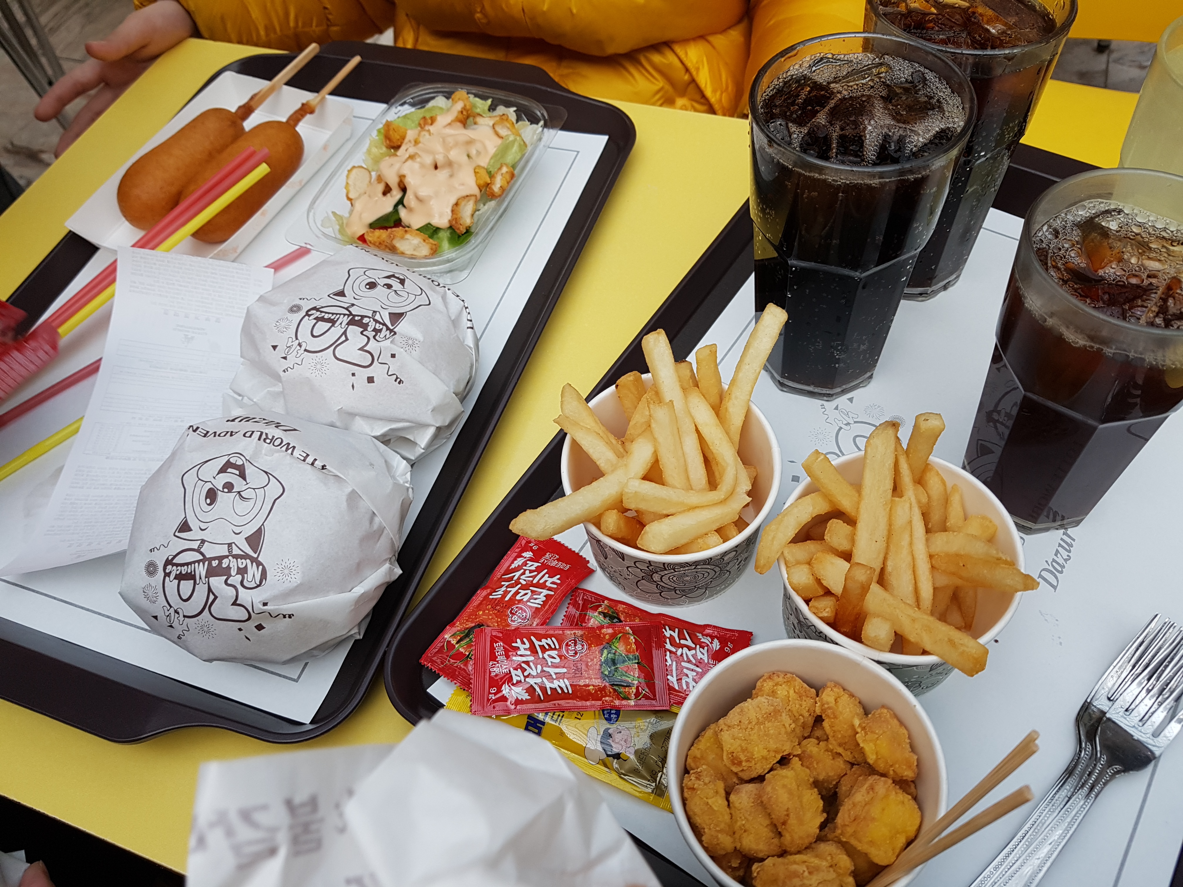 버거4개,음료4개,감자튀김2개,핫도그2개,샐러드,팝콘치킨까지 있습니다.