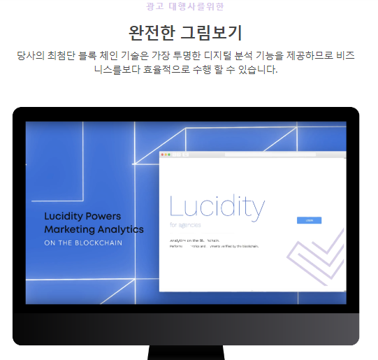 - 루시디티는 광고주에게 투명한 데이터를 제공함으로써 광고의 효과를 정확히 측정할수 있도록 지원합니다. 또한 광고 매체는 진행중인 광고의 가치를 증명하고 신원도용을 방지할 수 있게 됩니다.