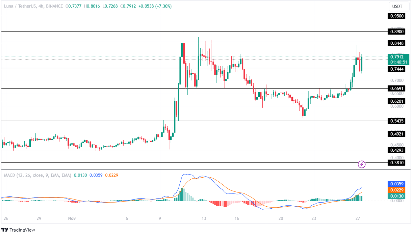 Recent events have added complexity to the LUNA saga. A 15% surge broke the coin out of its key level, bringing it close to the support/resistance level of $0.7444. The current scenario suggests an imminent move, the outcome of which remains uncertain.