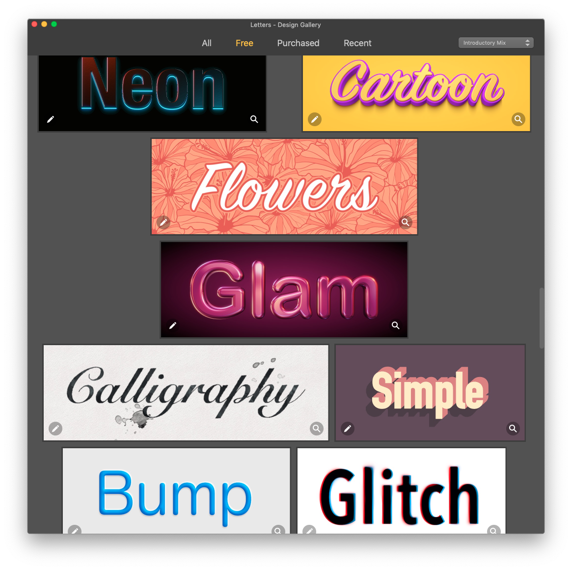 간단히 사용법을 살펴 보면 우선 앱을 켜게 되면 하단에 사용할 수 있는 템플릿 들이 뜨게 됩니다. 이제 구매 한 내역이 없으니 Free 를 눌러서 무료로 제공되는 템플릿들을 살펴 봅니다.