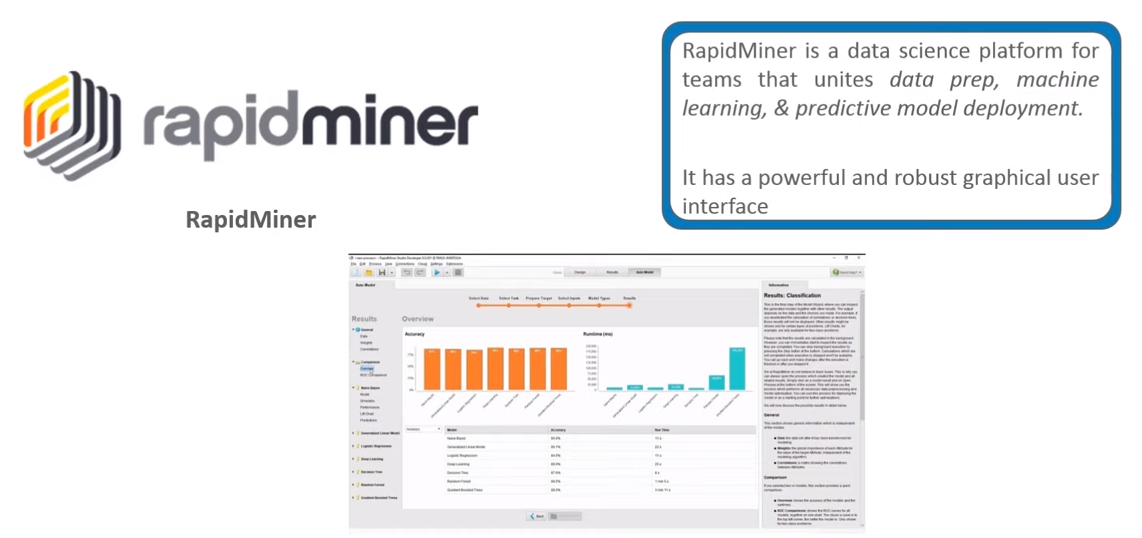 rapid miner the next tool which I'm going to talk about is a data science platform for teams that unites data preparation machine learning and predictive model deployment it has a powerful and robust and graphical user interface that enables user to create deliver and maintain predictive analytics with rapid miner uncluttered disorganized and seemingly useless data becomes very valuable as it simplifies data access and lets you structure them in a way that is easy for you and your team to comprehend now few of the features are that it results in visualization a lot through GUI it helps in designing and implementing analytical workflows.