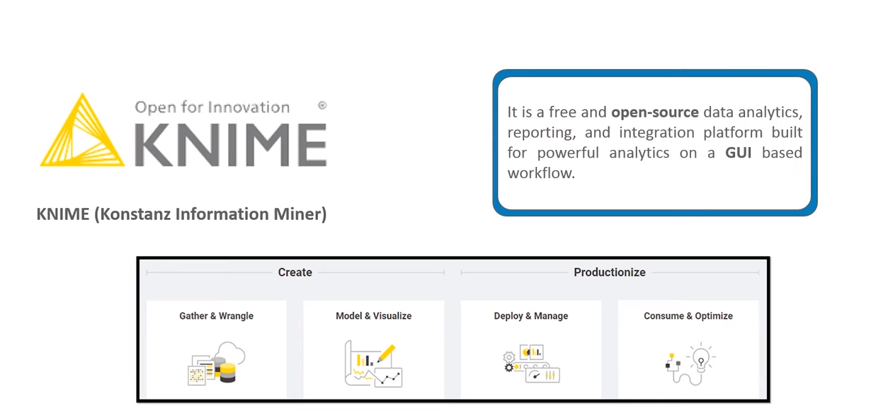 Next, I'm going to talk about is KNIME which is constants information minor. It is a free and open-source data analytics reporting and integration platform which is built for powerful analytics on a GUI based workflow. This means you do not have to know how to code to be able to walk using the KNIME and derive the insights. What you can do is you can walk all the way from gathering the data and creating models to deployment as well as production. It consolidates all the functions of the entire process into a single workflow you can gather and wrangle the data you can model and visualize you can deploy and manage and you can consume and optimize as well so it's an all-in-one package and the most an important aspect is you do not need to know how to code
