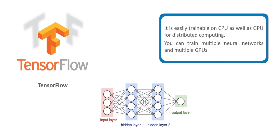 So the next library which I'm going to talk about is one of the best library out there for machine learning Which is Tensor flow. It is created by Google brain team and TensorFlow it's an open-source library for numerical computation and large-scale machine learning when it comes to artificial intelligence framework showdown you will find TensorFlow emerging as a clear winner most of the time now what makes it so special so TensorFlow provides an accessible and readable syntax which is essential for making these programming resources easier to use and being a low-level library provides more flexibility and with the new version of 2.0 it is just going to be on the top of any machine learning or deep learning purposes it is one of the best machine learning tools available and it also uses other high-level API's to make things little smoother and the most important thing is it can run on both CPU as well as GPU and it really helps in graphical purposes like if you are dealing with images videos TensorFlow is the way to go