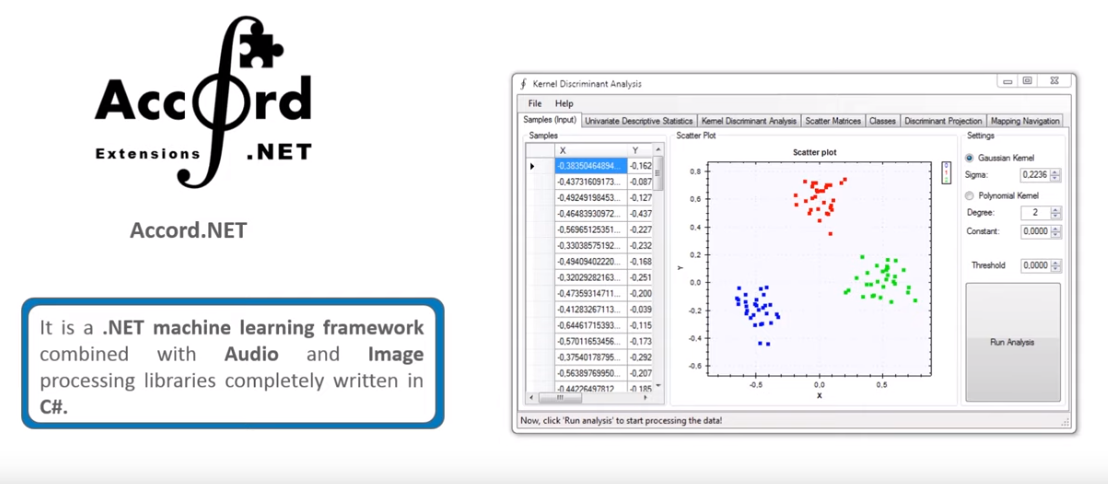 Now accord .NET is a .NET machine learning framework combined with audio and image processing libraries which are completely rewritten in C#. Now the tagline being machine learning made in a minute that's an amazing tagline guy and it is a complete framework for building production great computer vision computer audition signal processing and statistics application libraries are made available from the source code and through the executable installer and the NuGet packet manager.