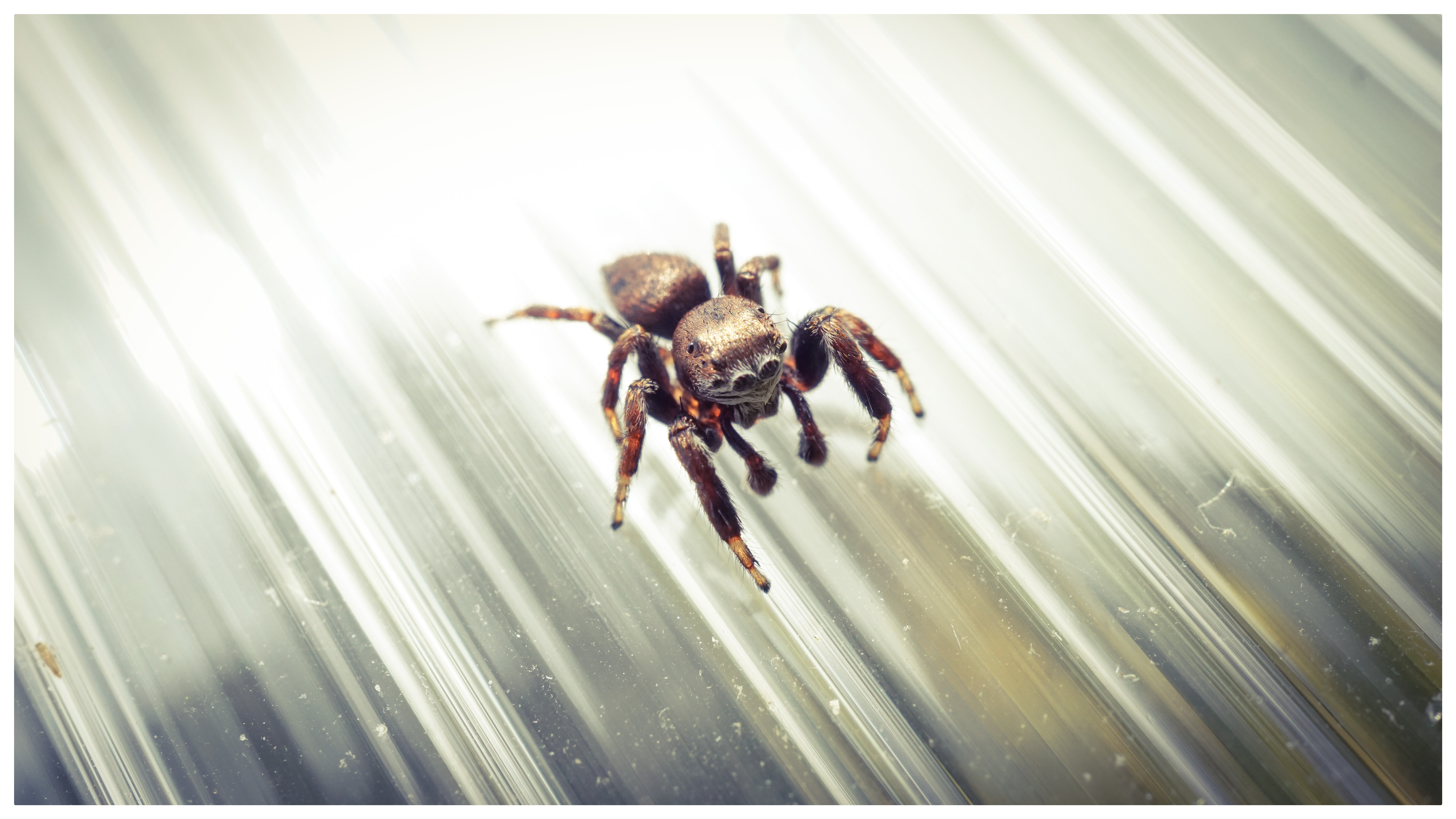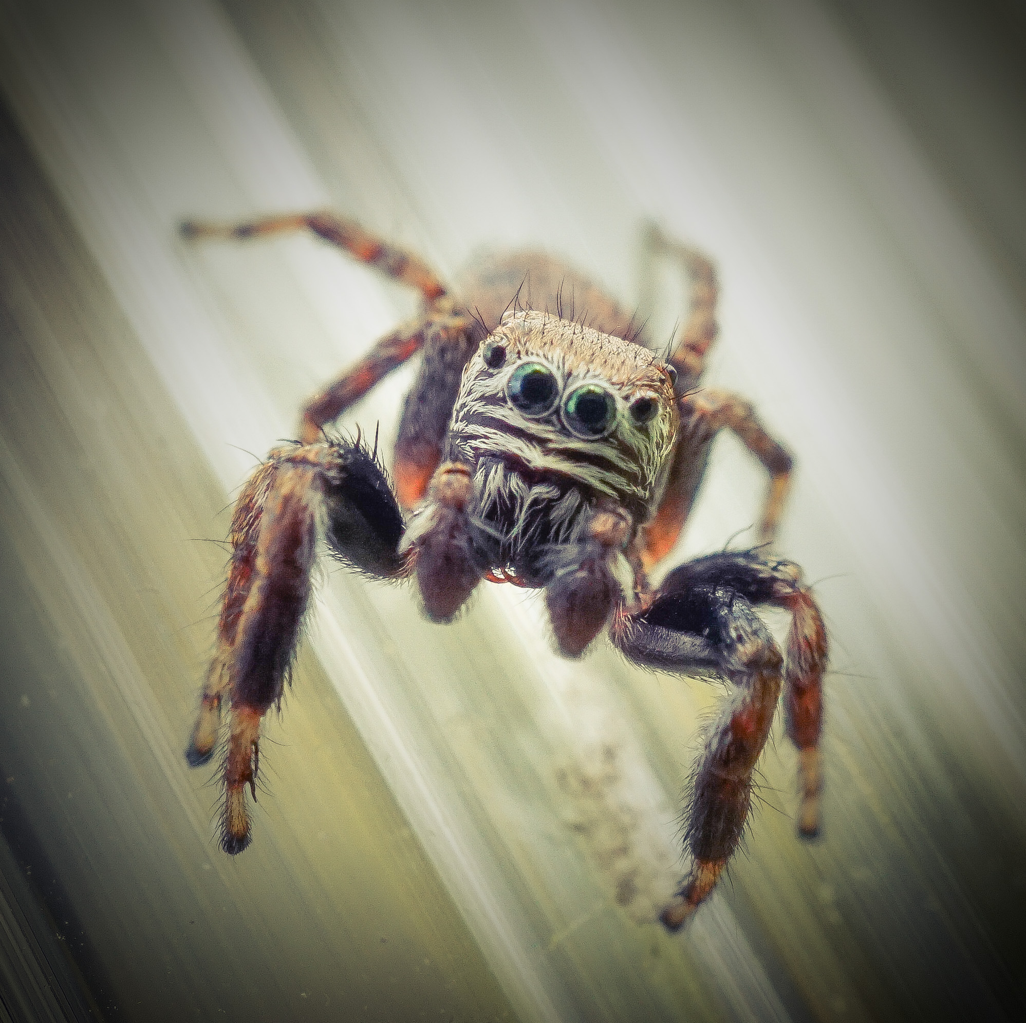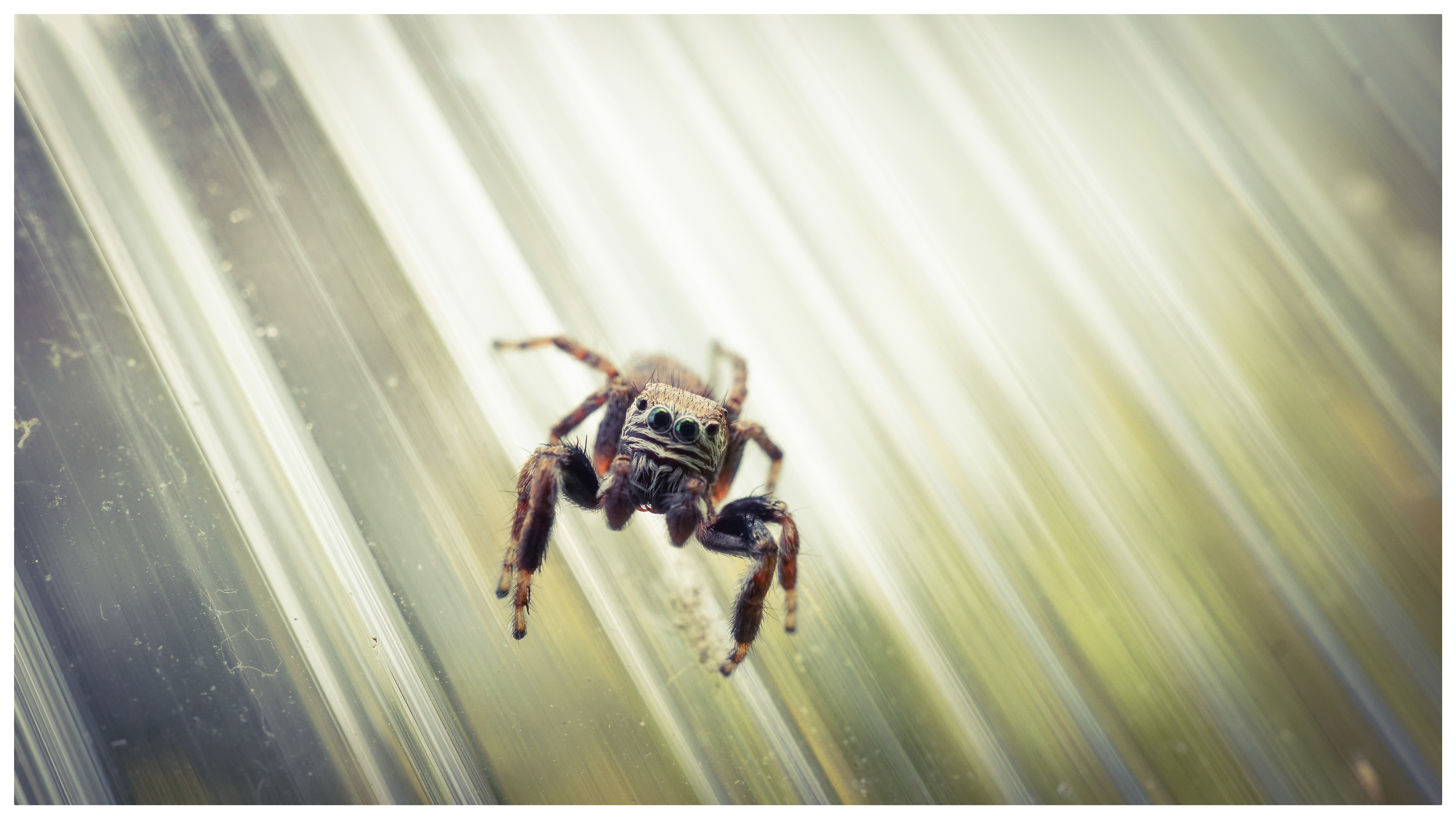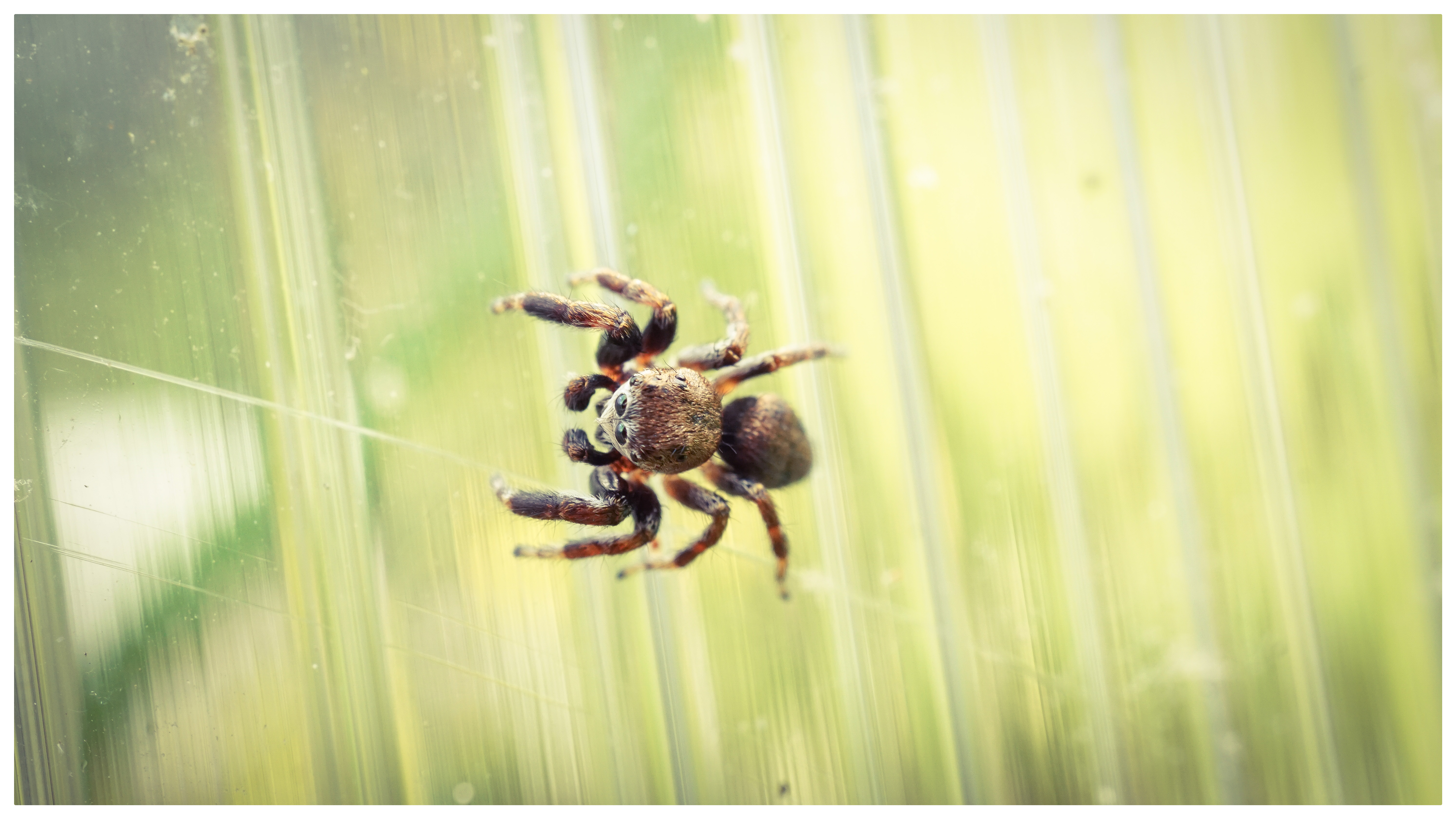 A small spider on my greenhouse, a spider that has cute eyes and always looks at every moving person with them. In order to see those cute eyes, I have to use the macro lens. I can't remember the name of this species, but this spider can jump very far, and it also catches own prey by jumping.
