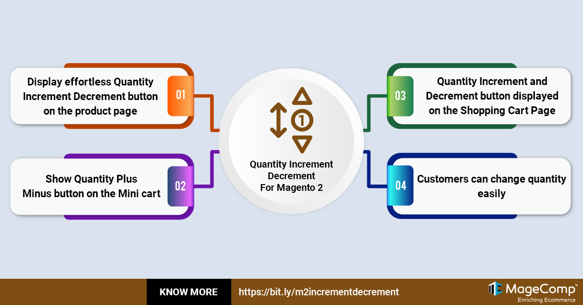 Changing the quantity of the product is an area to care about. The default Magento does provide the functionality to change the quantity of the product but the customer has to write in numbers. rather, tapping the button to change the quantity is quite comfortable to them. And also, returning back to the product page to modify the number of products to purchase when you are already at the checkout page is quite tiring. Hence, to conquer these obstacles for the customers, MageComp has launched the Magento 2 Quantity Increment Decrement module.