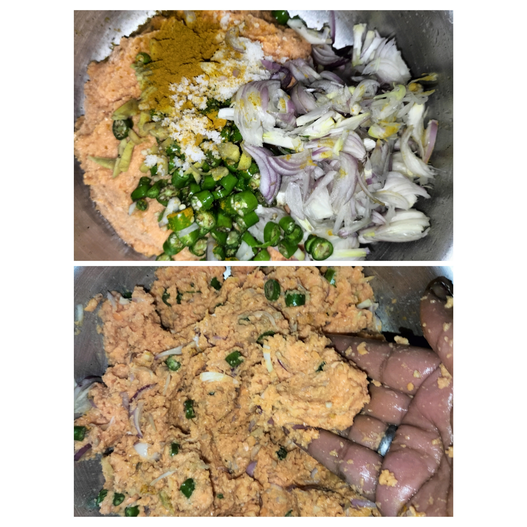 এখন মসুর ডালে আগে থেকে কুচি করে রাখা সব উপকরণ দিয়ে মেখে নিয়েছি।