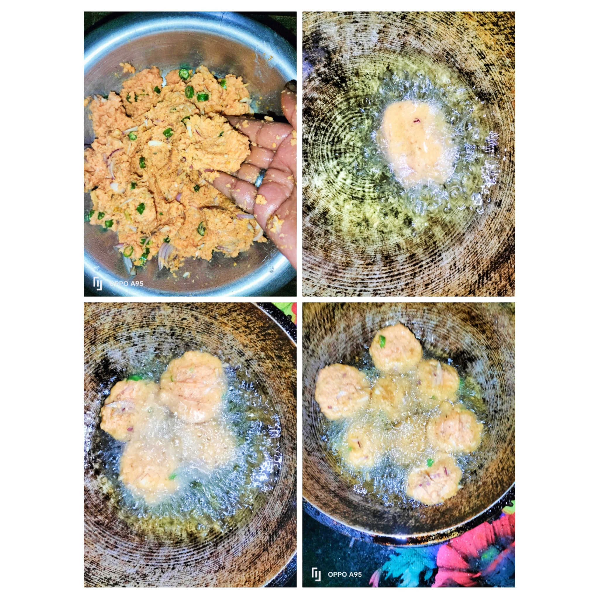 এখন মাখা ডাল গুলো হাত দিয়ে বড়া আকার করে গরম তেলে দিয়েছি।