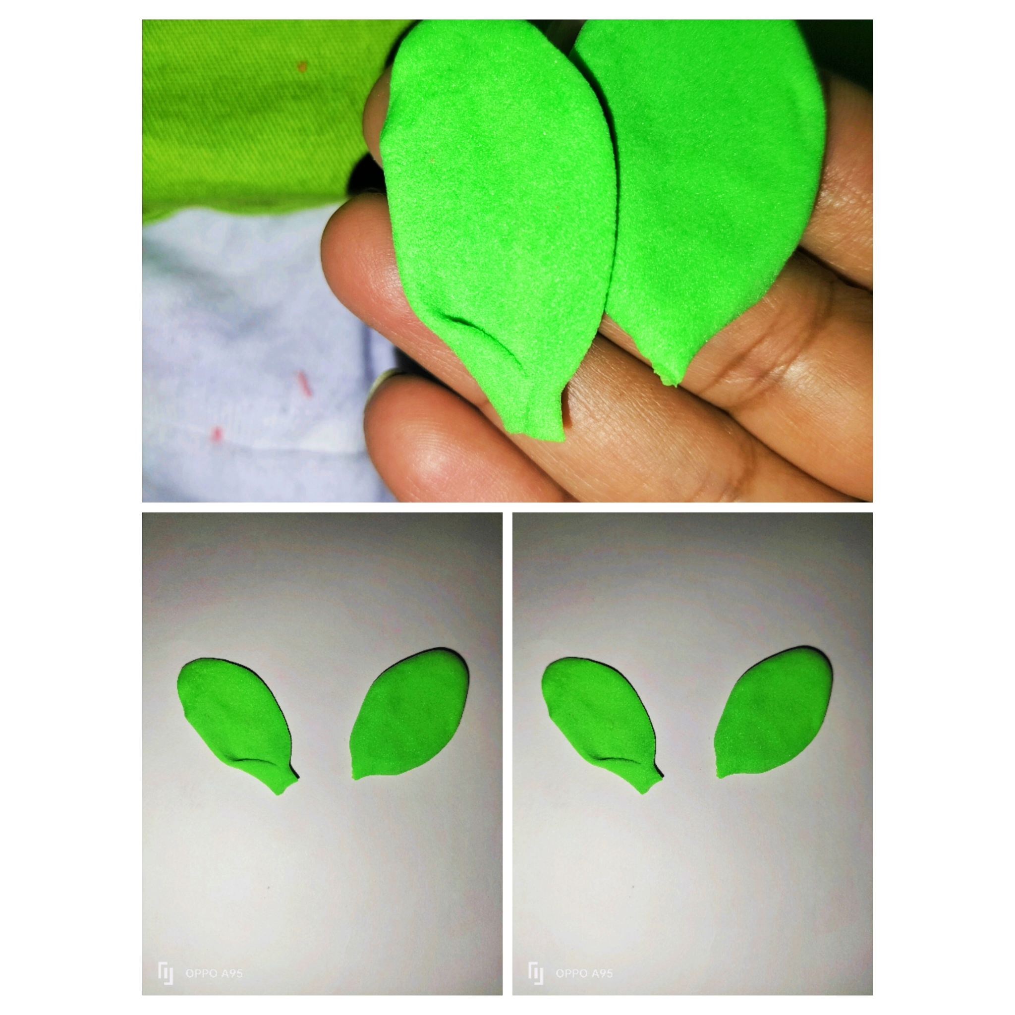 এখন সবুজ ক্লে দিয়ে দুটো জবা ফুলের পাতা বানিয়েছি ও খাতায় বসিয়েছি।