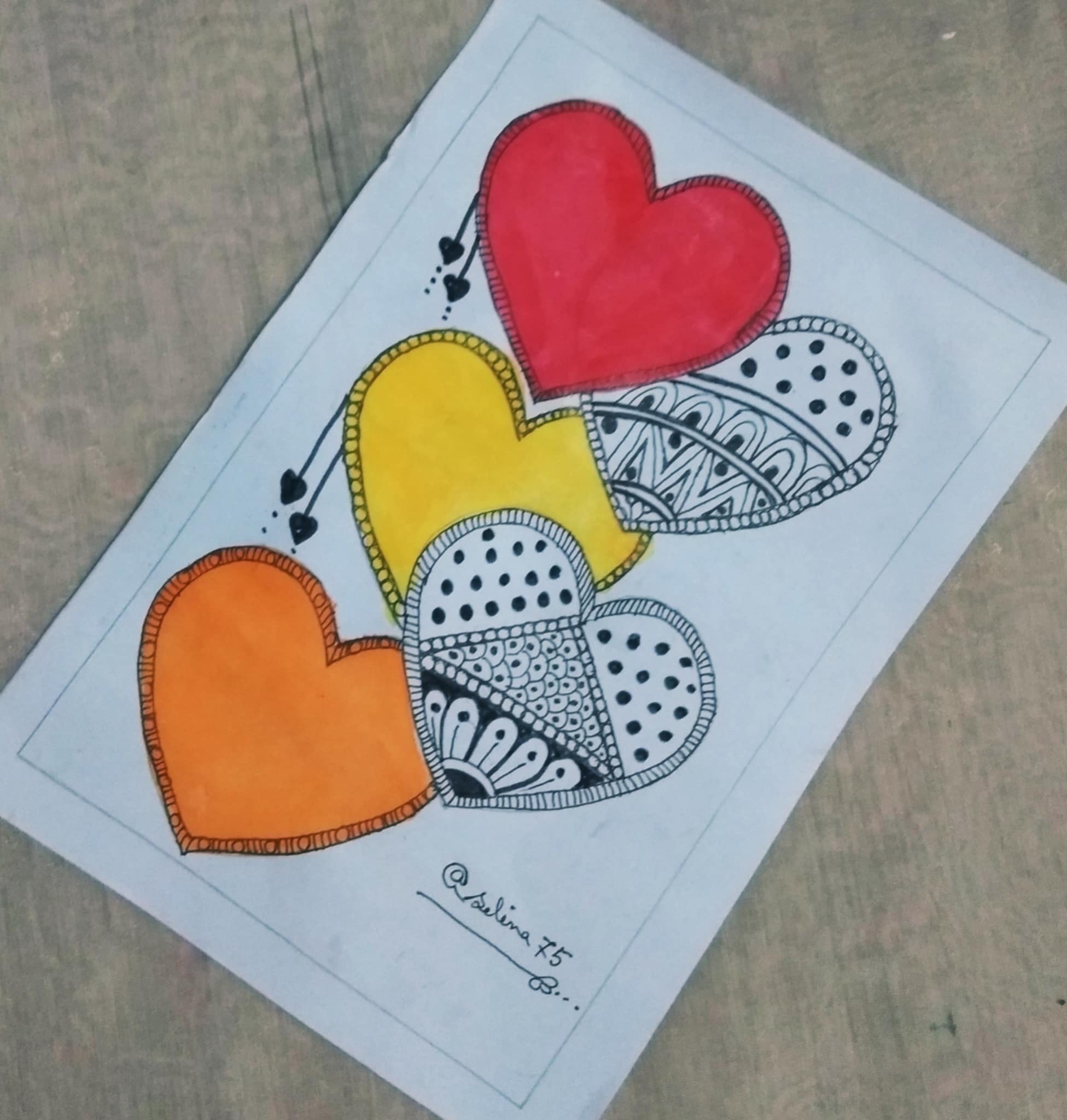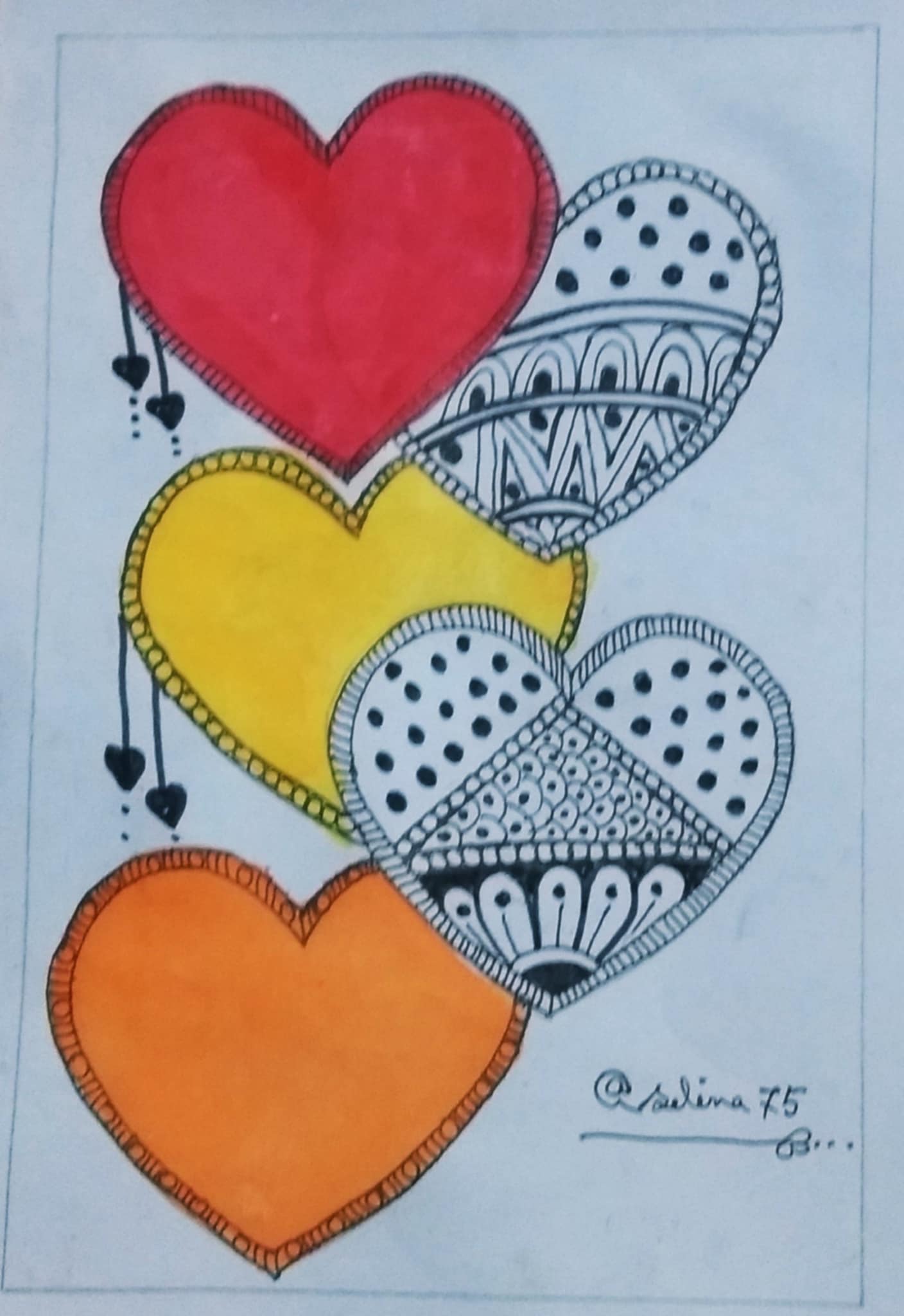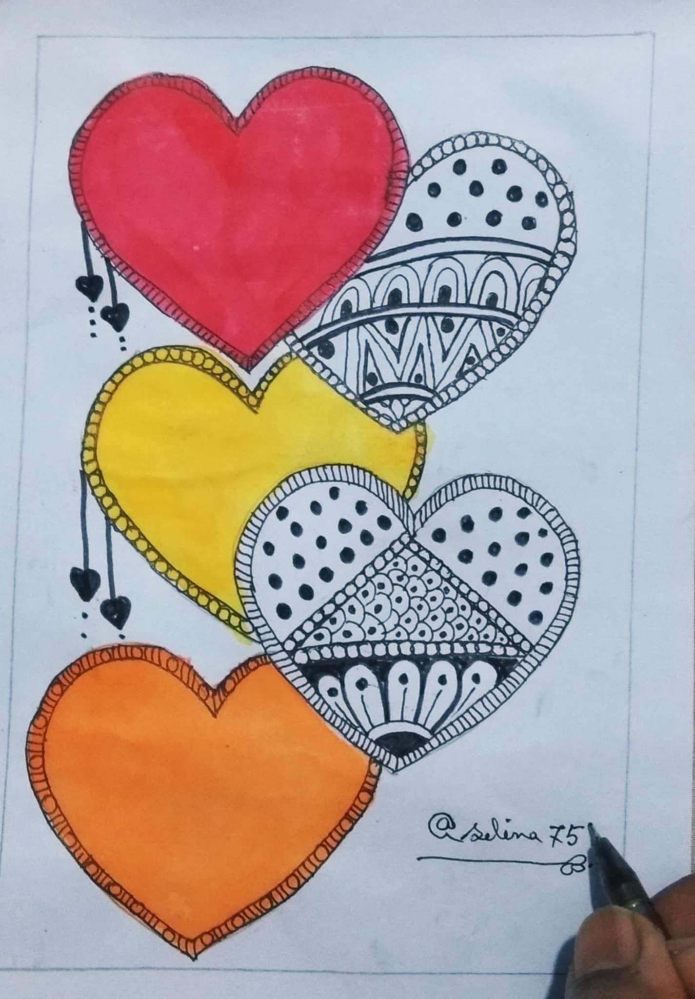হার্ট শেপগুলোর আউট লাইন কালো জেল পেন দিয়ে দাগ দিয়ে নিয়েছি। এবং পেন্সিলের দাগ রাবার দিয়ে মুছে দিয়েছি। সেই সাথে কিছু ডিজাইন করে নিয়েছি আউট লাইনে।