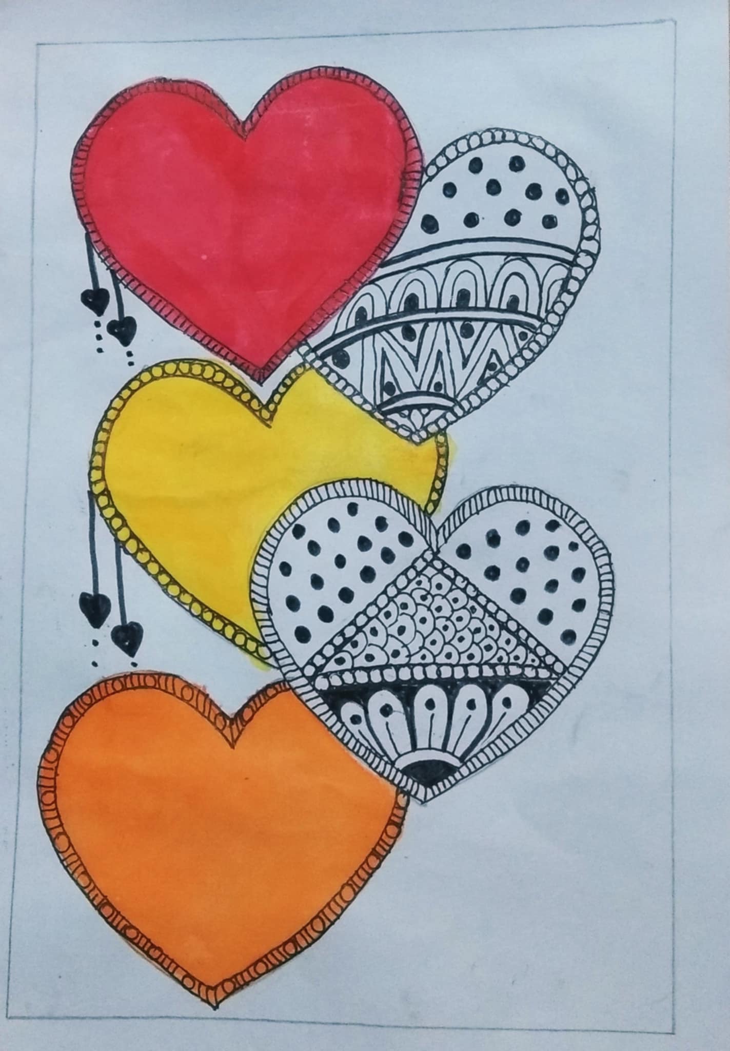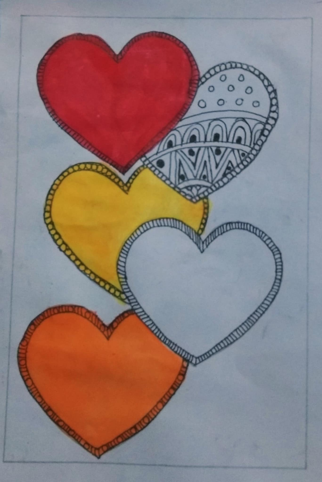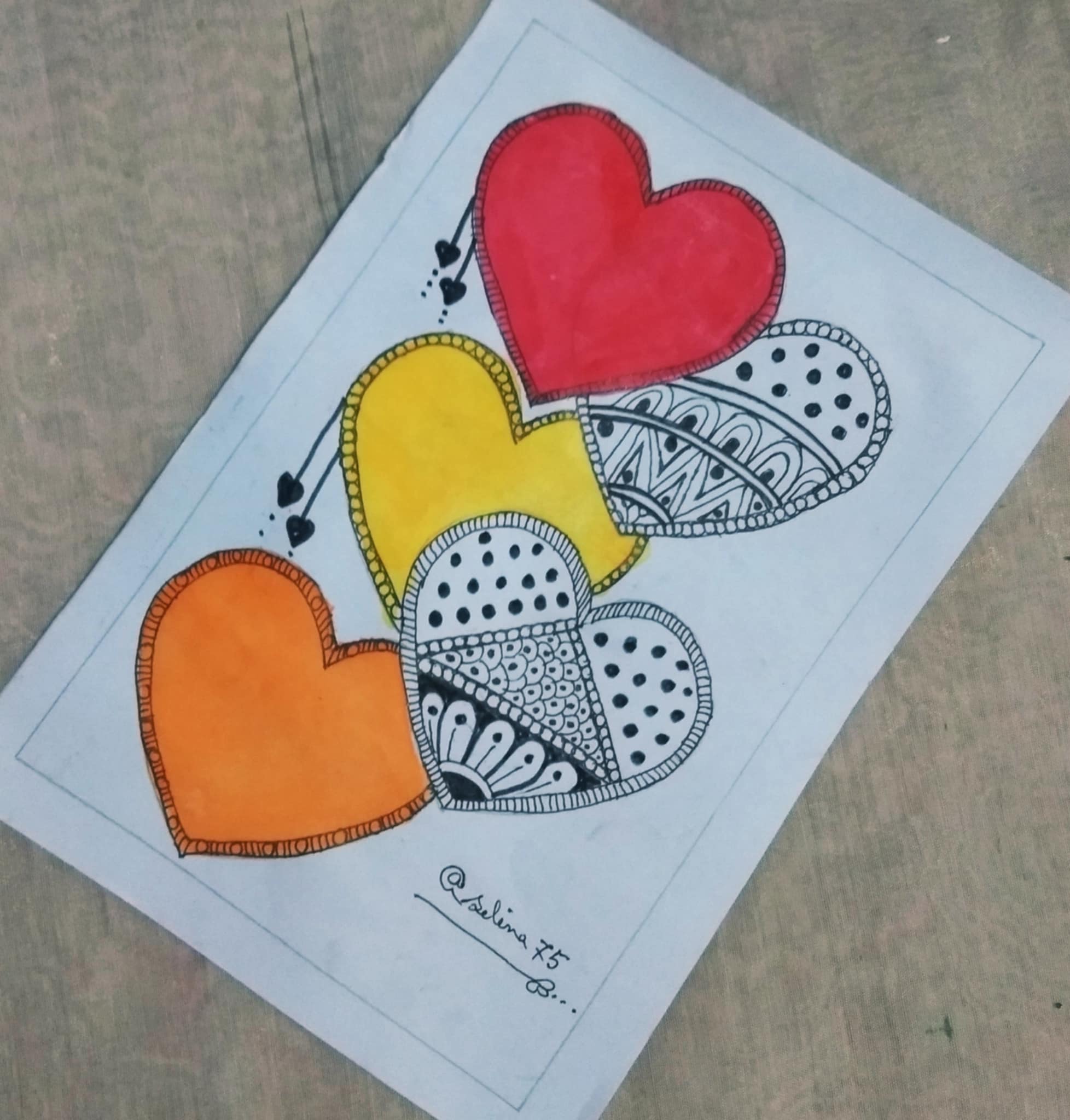 হার্ট শেপগুলোর আউট লাইন কালো জেল পেন দিয়ে দাগ দিয়ে নিয়েছি। এবং পেন্সিলের দাগ রাবার দিয়ে মুছে দিয়েছি। সেই সাথে কিছু ডিজাইন করে নিয়েছি আউট লাইনে।