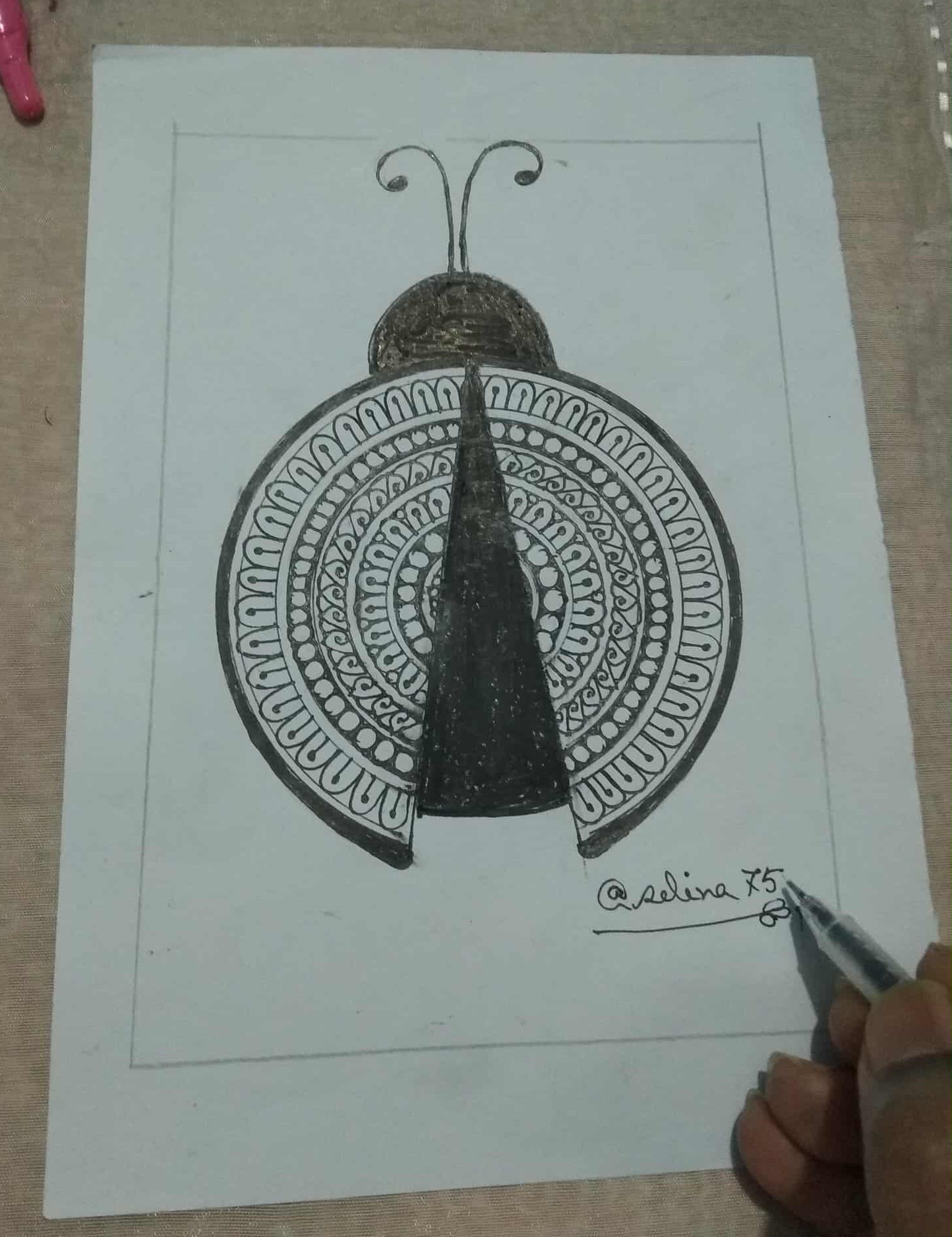 এবার বাকী বৃত্তগুলোতেও বিভিন্ন ডিজাইন এঁকে ভরাট করে নিয়েছি। এবং মাঝখানের ফাঁকা অংশ কালো রং এর পেন্সিল রং দিয়ে কালো করে নিয়েছি। সেই সাথে লেডি বাগের মাথাও কালো রং করে নিয়েছি।