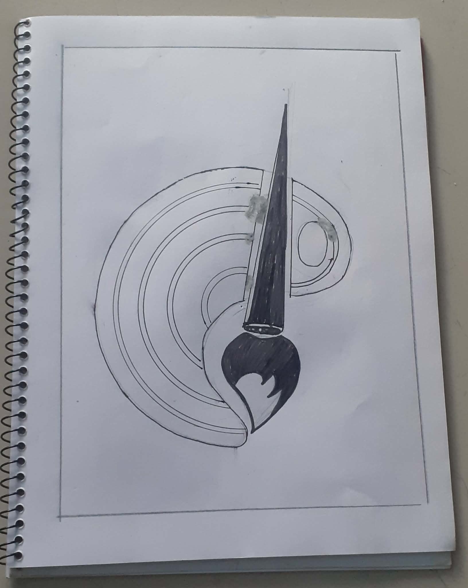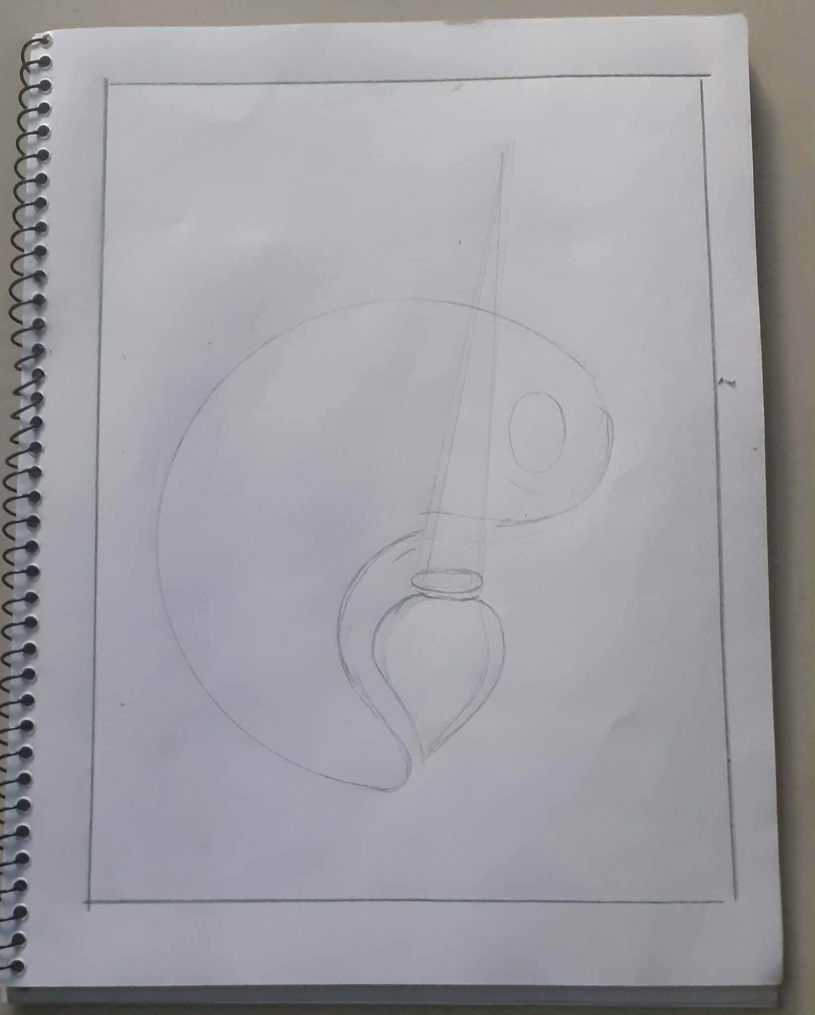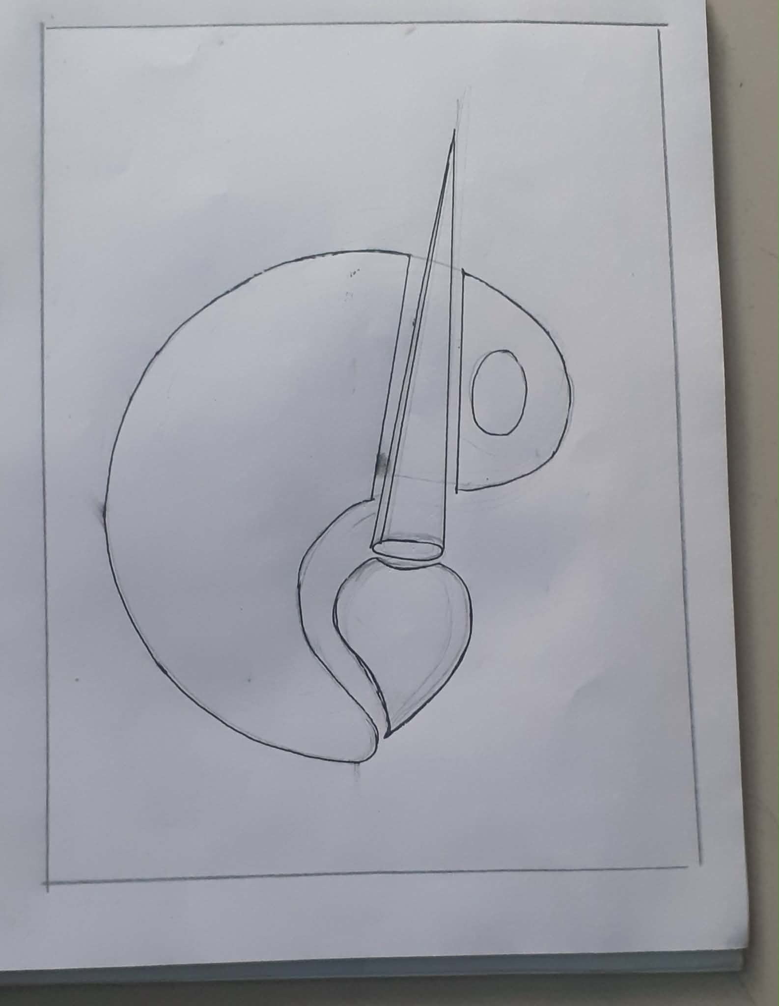 প্রথমে সাদা কাগজের চারপাশে দাগ দিয়ে নিয়েছি। দাগের ভিতরে পেন্সিল কম্পাস এর সাহায্যে একটি ব্রাশ সহ পেইন্ট প্লেট অঙ্কন করে নিয়েছি।