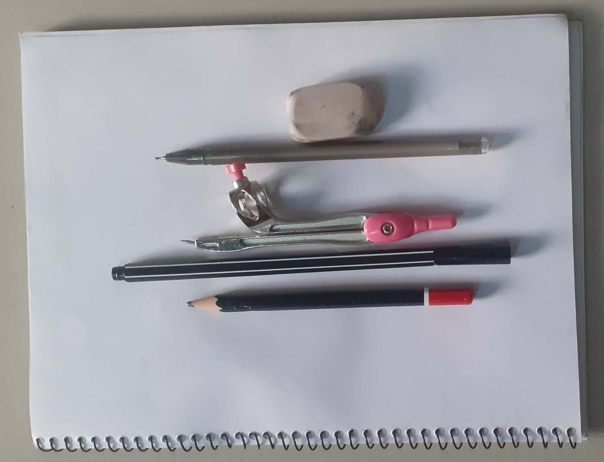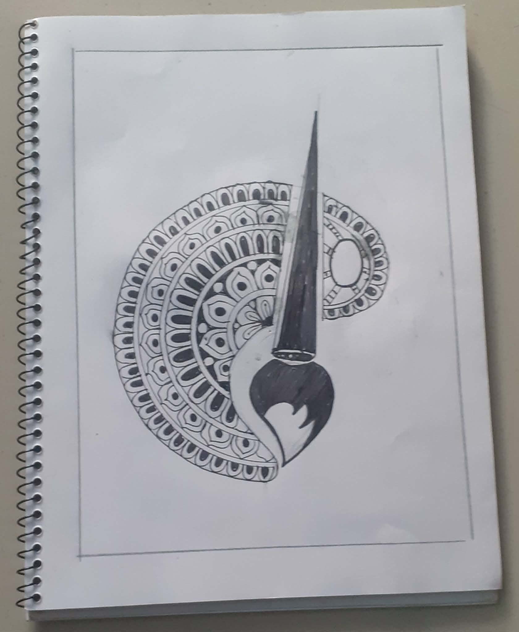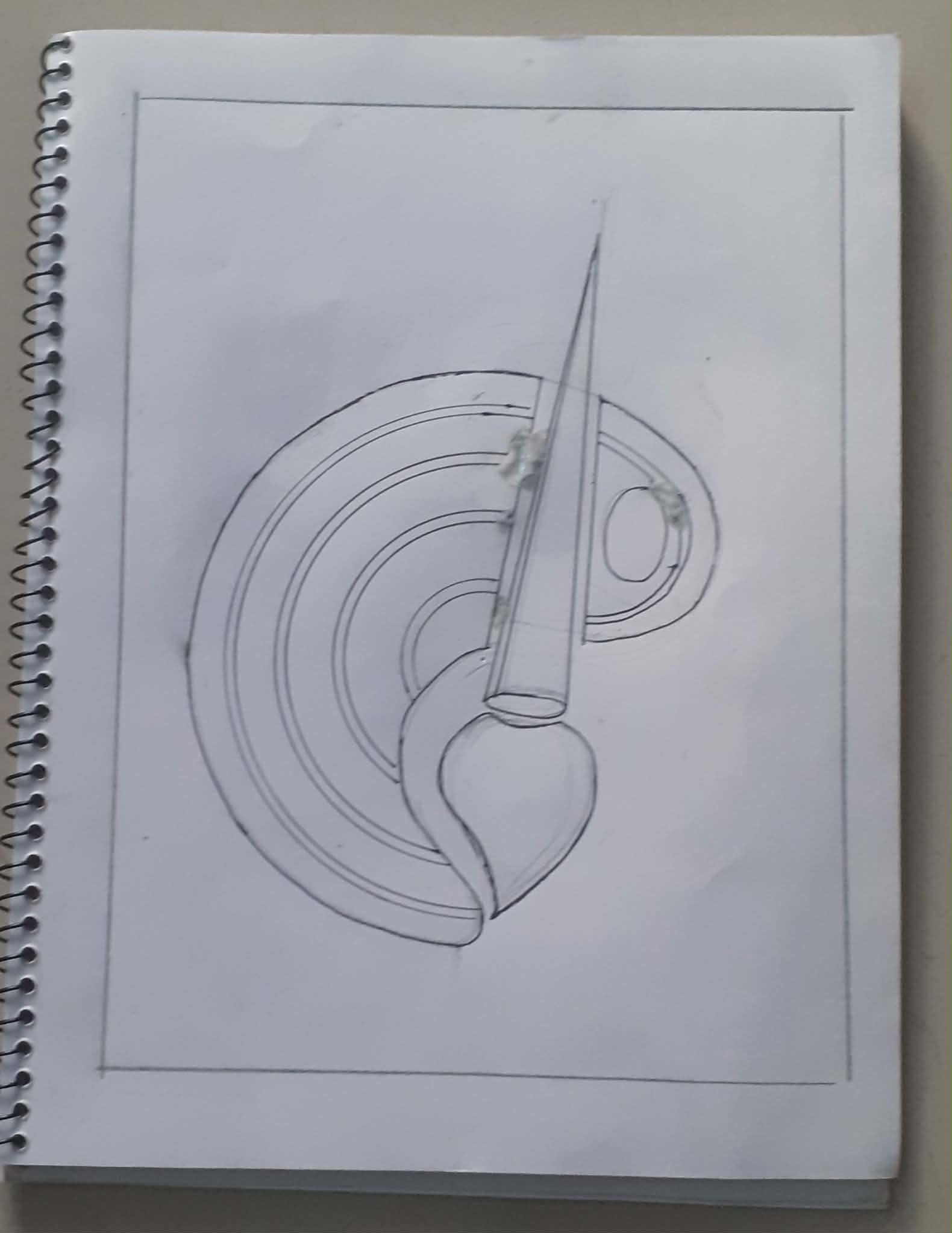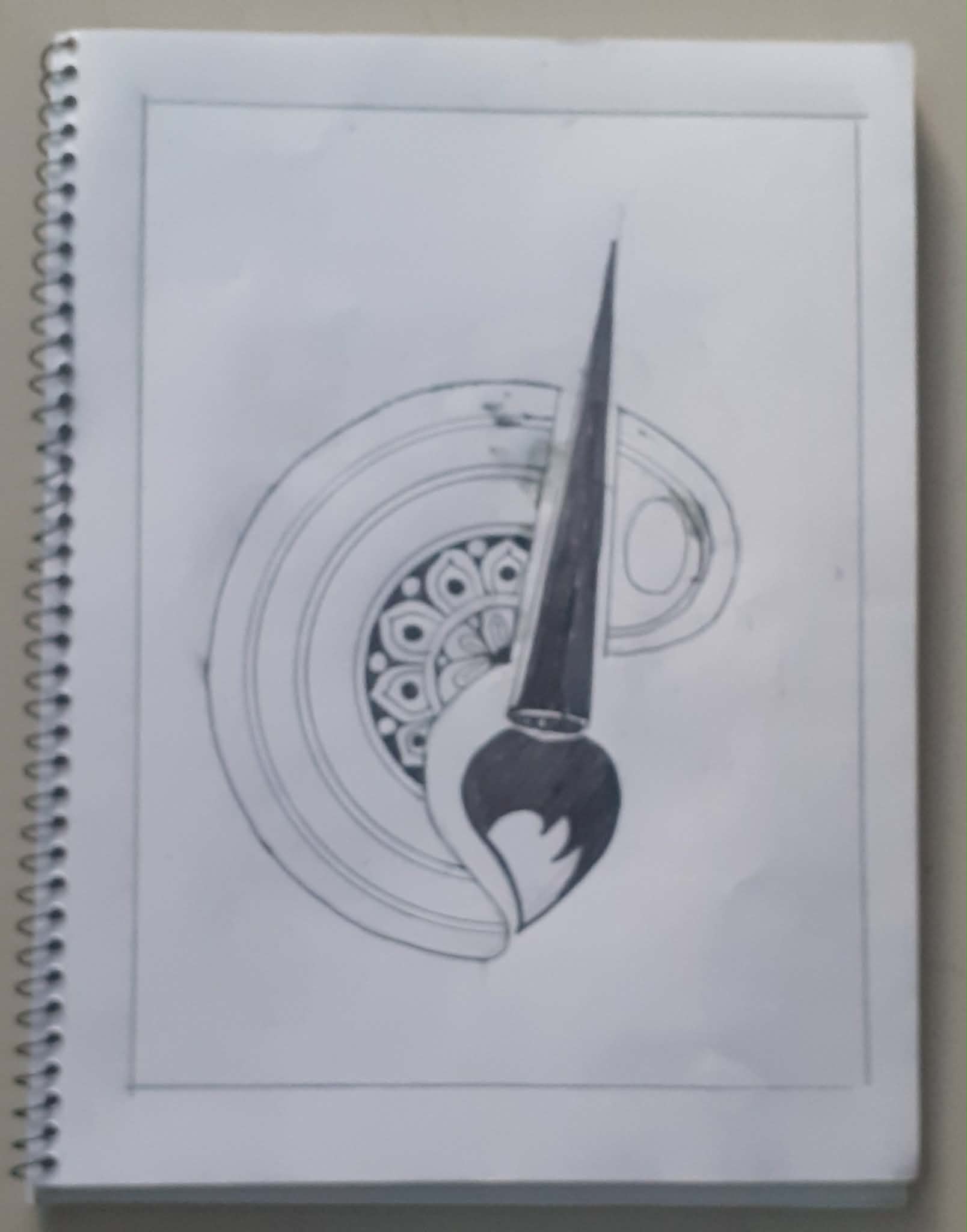 প্রথমে সাদা কাগজের চারপাশে দাগ দিয়ে নিয়েছি। দাগের ভিতরে পেন্সিল কম্পাস এর সাহায্যে একটি ব্রাশ সহ পেইন্ট প্লেট অঙ্কন করে নিয়েছি।