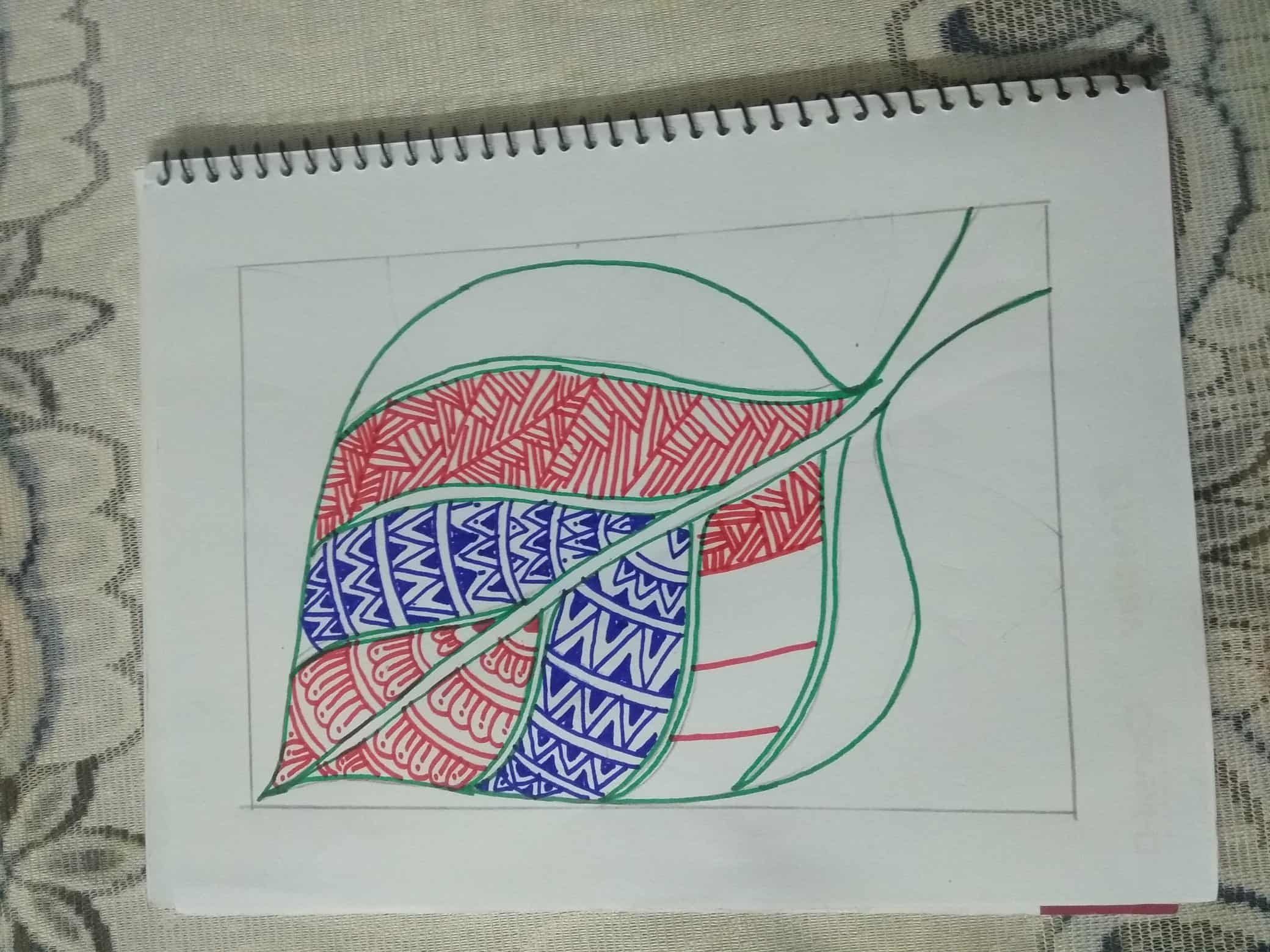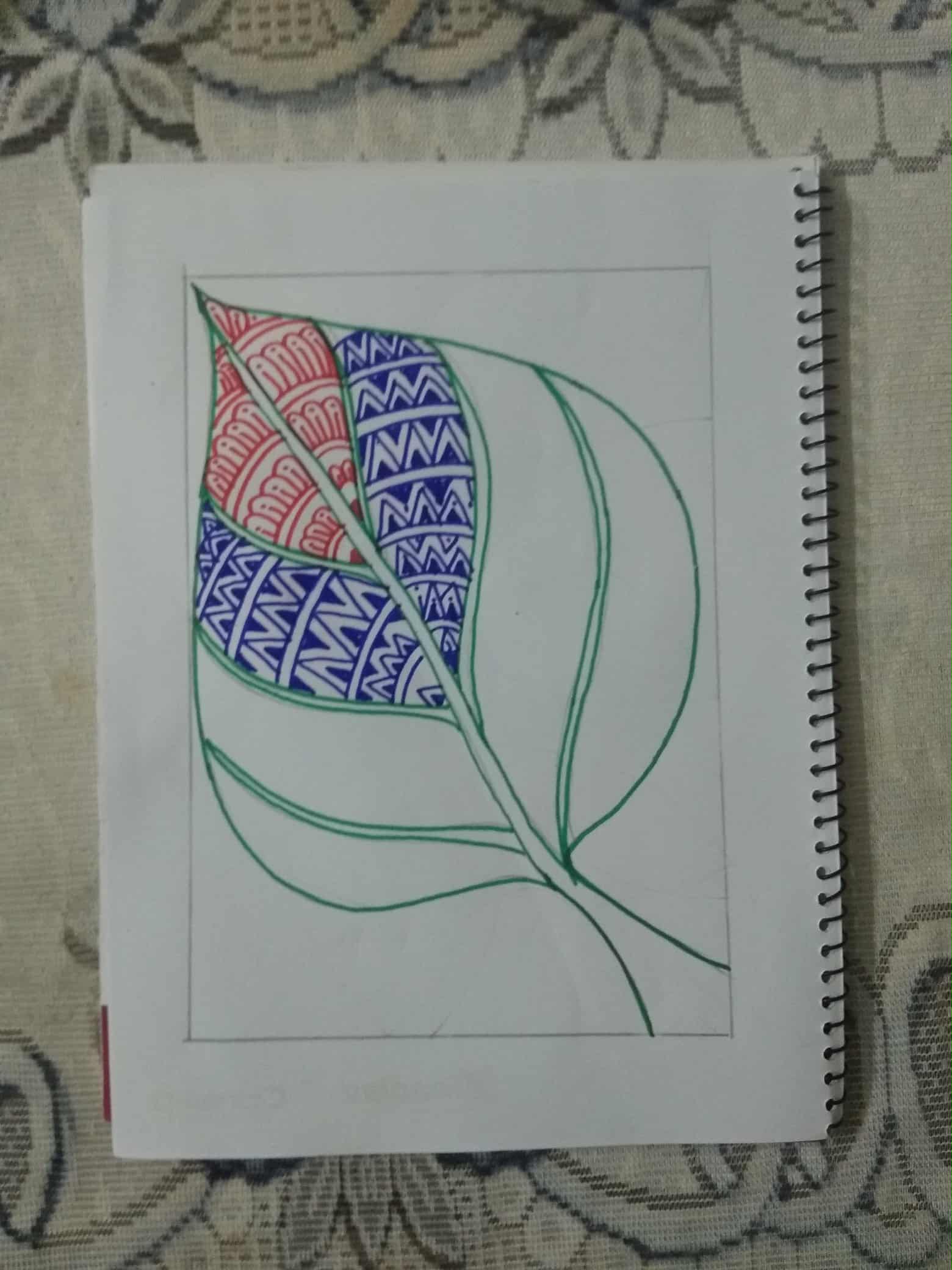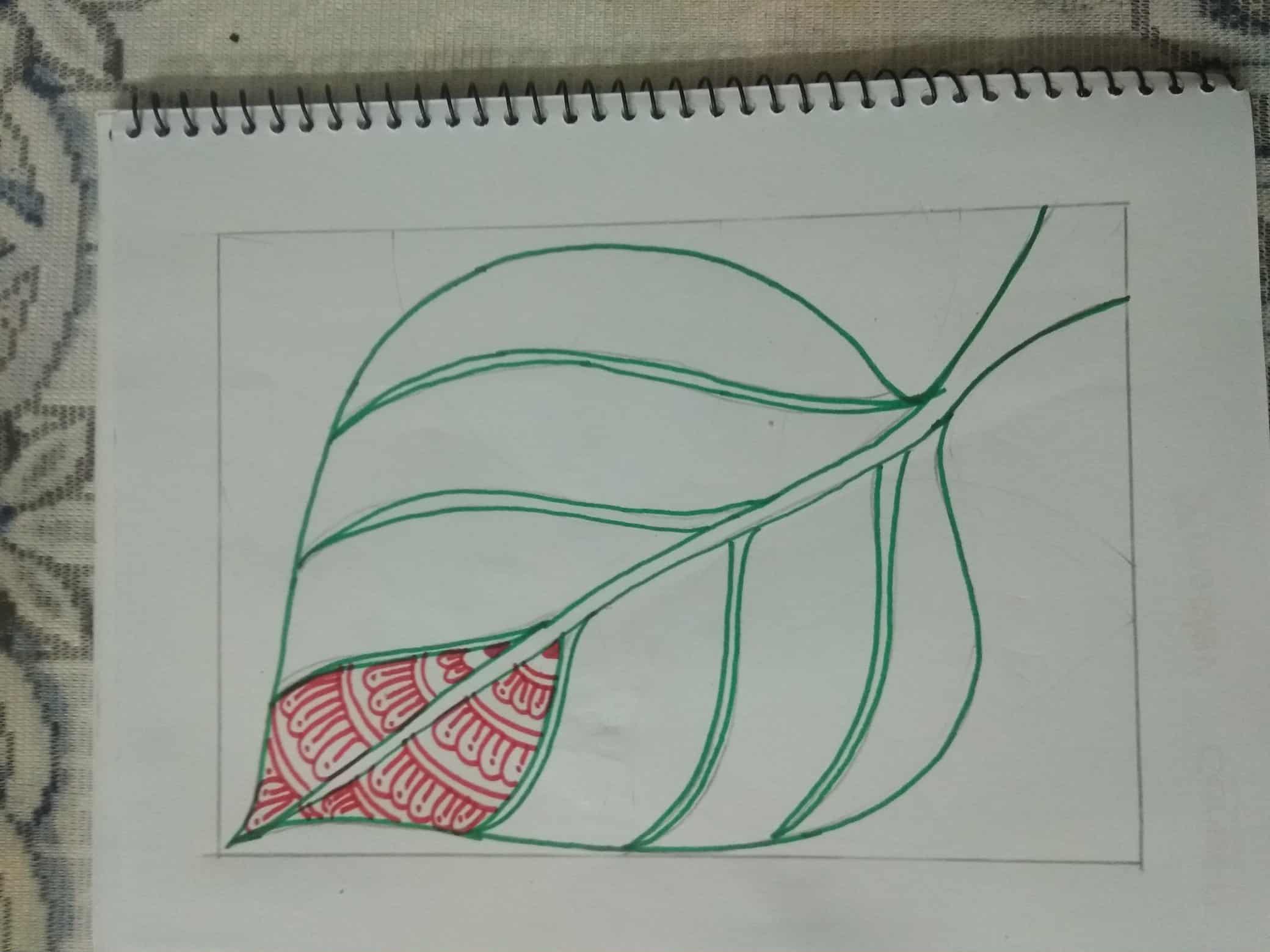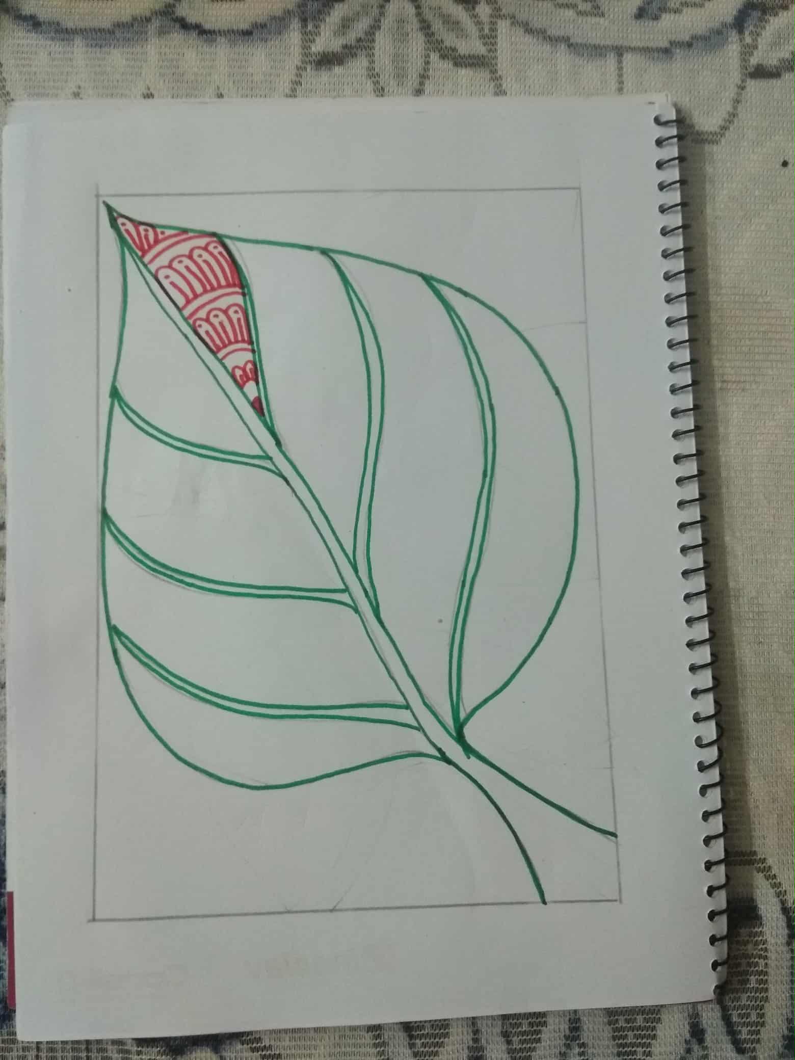 সবুজ সাইন পেন দিয়ে পাতার অন্য অংশে ডিজাইন একে ভরাট করে নিয়েছি।